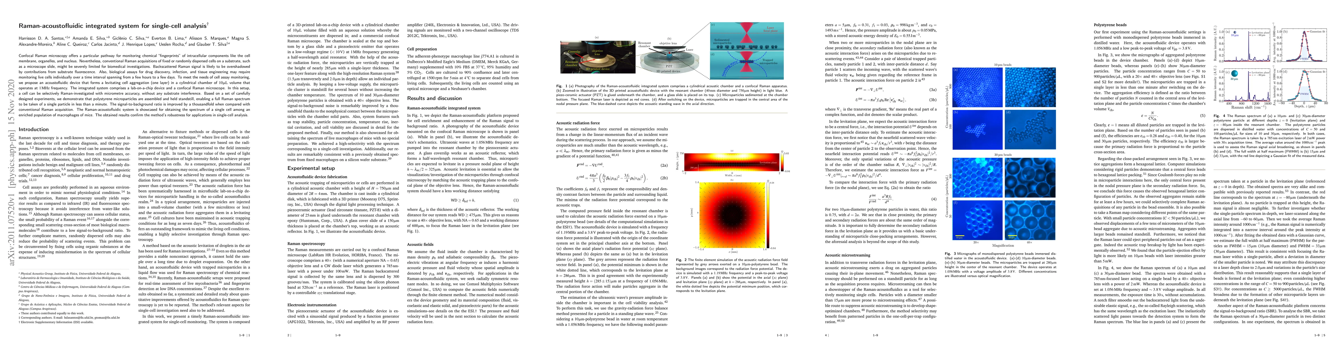 Confocal Raman microscopy offers a particular pathway for monitoring chemical "fingerprints" of intracellular components like the cell membrane, organelles, and nucleus. Nevertheless, conventional Raman acquisitions of fixed or randomly dispersed cells on a substrate, such as a microscope slide, might be severely limited for biomedical investigations. Backscattered Raman signal is likely to be overshadowed by contributions from substrate fluorescence. Also, biological assays for drug discovery, infection, and tissue engineering may require monitoring live cells individually over a time interval spanning from a few hours to a few days. To meet the needs of cell assay monitoring, we propose an acoustofluidic device that forms a levitating cell aggregation (one layer) in a cylindrical chamber of 10 {\mu}L volume that operates at 1 MHz frequency. The integrated system comprises a lab-on-a-chip device and a confocal Raman microscope. In this setup, a cell can be selectively Raman-investigated with micrometre accuracy, without any substrate interference. Based on a set of carefully designed experiments, we demonstrate that polystyrene microparticles are assembled and held standstill, enabling a full Raman spectrum to be taken of a single particle in less than a minute. The signal-to-background ratio is improved by a thousandfold when compared with conventional Raman acquisition. The Raman-acoustofluidic system is showcased for obtaining the spectrum of a single cell among an enriched population of macrophages of mice. The obtained results confirm the method's robustness for applications in single-cell analysis.