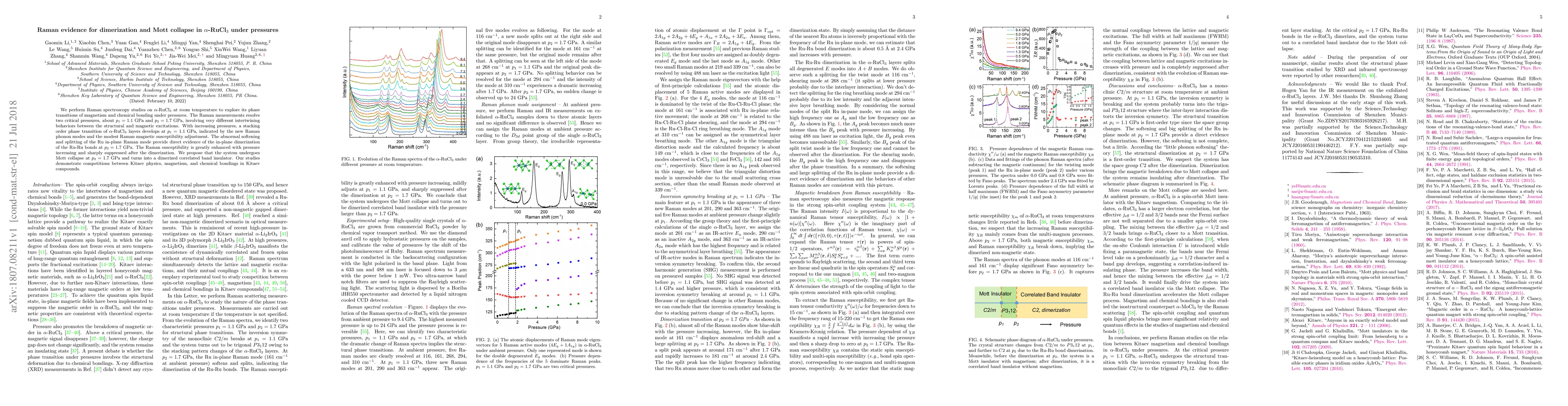 We perform Raman spectroscopy studies on $\alpha$-RuCl$_3$ at room temperature to explore its phase transitions of magnetism and chemical bonding under pressures. The Raman measurements resolve two critical pressures, about $p_1=1.1$~GPa and $p_2=1.7$~GPa, involving very different intertwining behaviors between the structural and magnetic excitations. With increasing pressures, a stacking order phase transition of $\alpha$-RuCl$_3$ layers develops at $p_1=1.1$~GPa, indicated by the new Raman phonon modes and the modest Raman magnetic susceptibility adjustment. The abnormal softening and splitting of the Ru in-plane Raman mode provide direct evidence of the in-plane dimerization of the Ru-Ru bonds at $p_2=1.7$~GPa. The Raman susceptibility is greatly enhanced with pressure increasing and sharply suppressed after the dimerization. We propose that the system undergoes Mott collapse at $p_2=1.7$~GPa and turns into a dimerized correlated band insulator. Our studies demonstrate competitions between Kitaev physics, magnetism, and chemical bondings in Kitaev compounds.