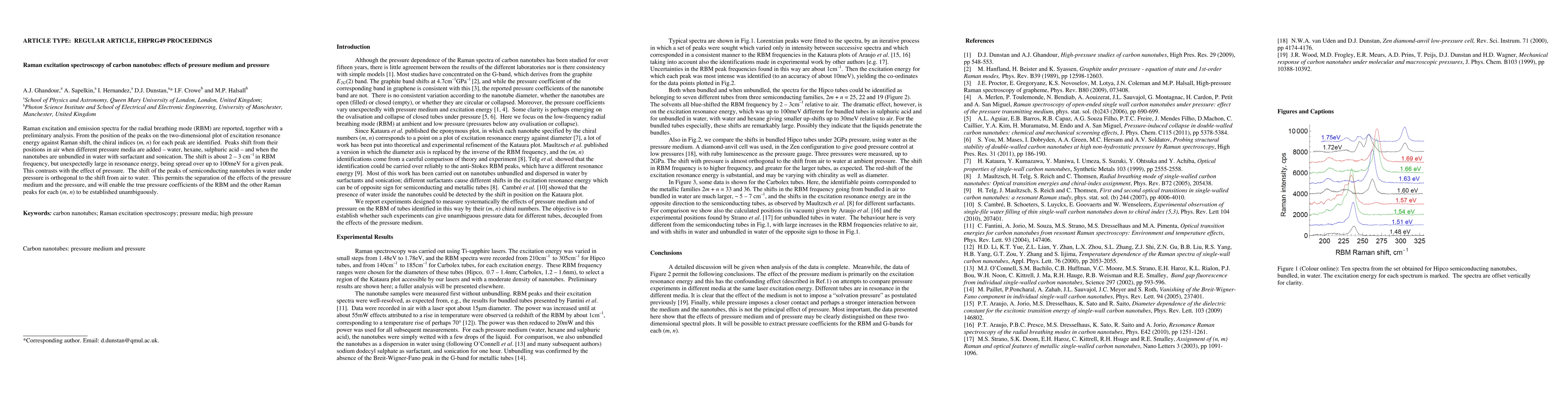 Raman spectroscopy was carried out using Ti-sapphire lasers with excitation energy varied in small steps. RBM spectra were recorded for Hipco and Carbolex tubes in different pressure media (water, hexane, sulphuric acid) and under pressure, with nanotubes unbundled using surfactants and sonication for better identification by chiral numbers (m, n).