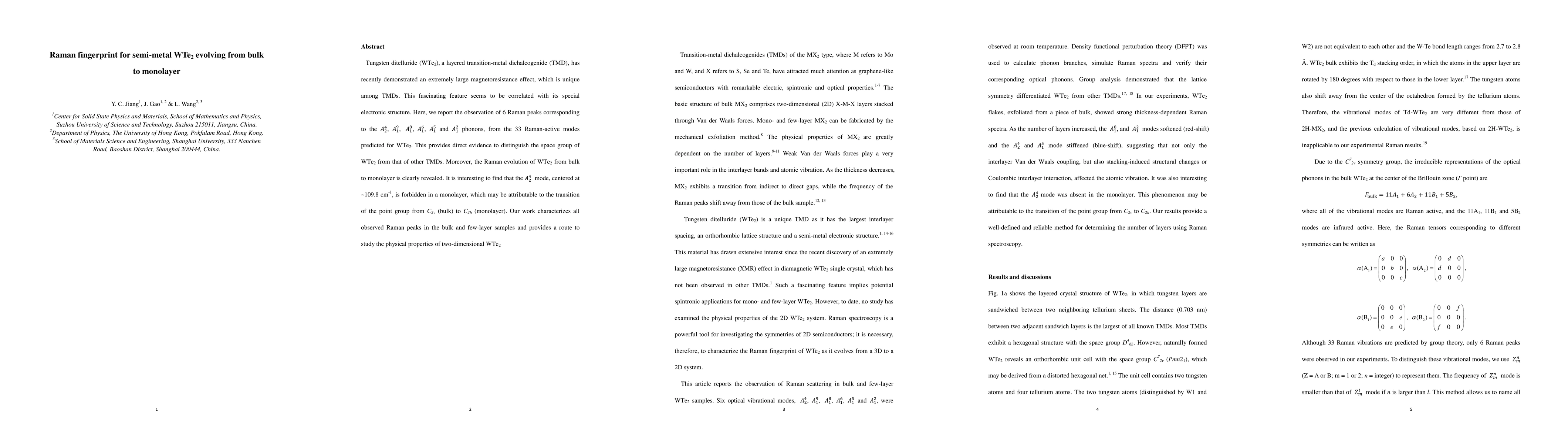 This paper identifies six Raman peaks in WTe2, confirming its unique phonon modes and distinguishing its space group from other TMDs. It further reveals the Raman spectral evolution from bulk to monolayer, noting the disappearance of the A_2^4 mode in monolayers due to the change in point group symmetry from C2v to C2h.