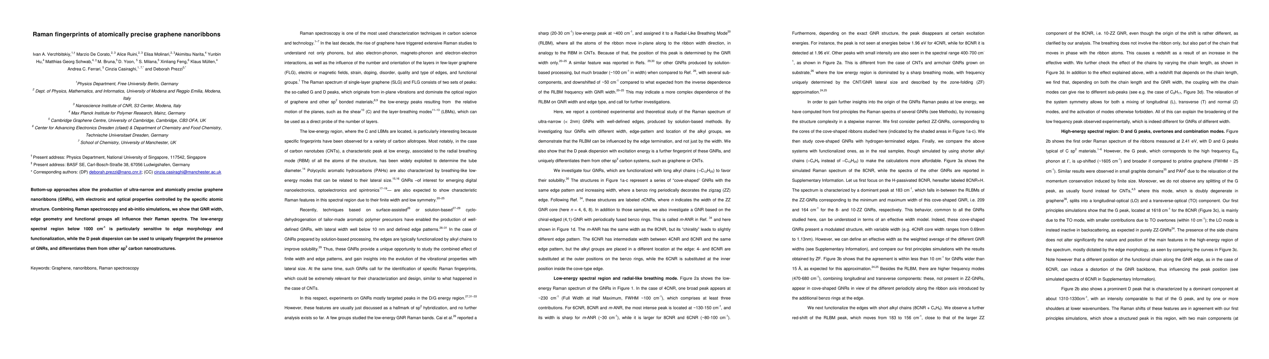 The study reveals that Raman spectroscopy can precisely characterize the atomic structure of graphene nanoribbons (GNRs) by identifying influences from width, edge geometry, and functional groups, with a particular sensitivity in the low-energy spectral region. The D peak dispersion serves as a unique fingerprint for GNRs, distinguishing them from other carbon nanostructures.