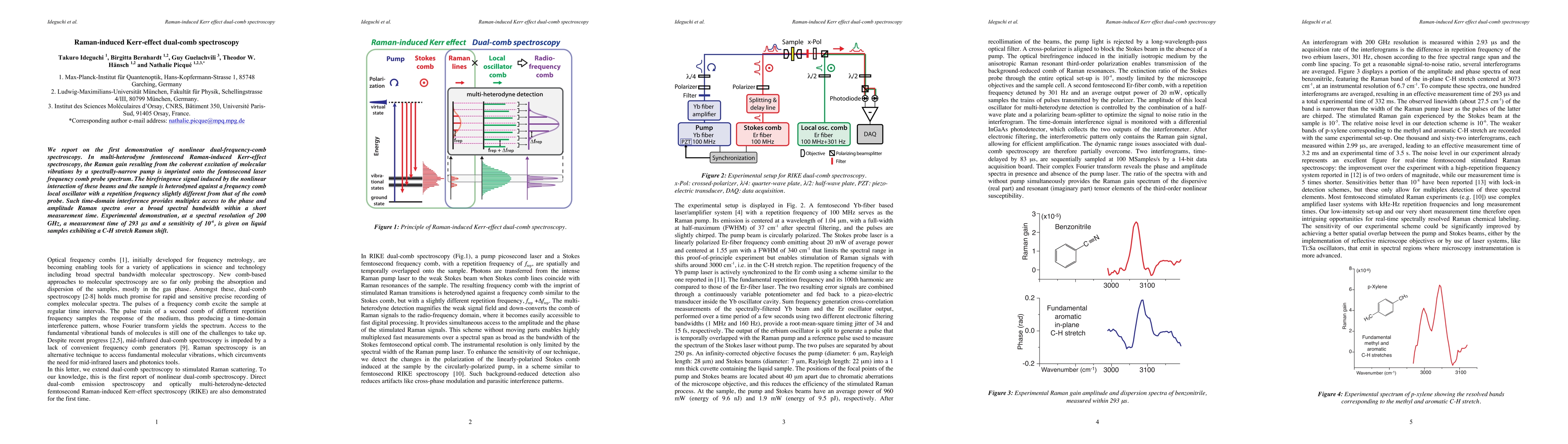 This paper demonstrates nonlinear dual-frequency-comb spectroscopy using Raman-induced Kerr-effect, achieving multiplex access to phase and amplitude Raman spectra over a broad bandwidth in a short time. The technique shows a resolution of 200 GHz, a measurement time of 293 μs, and a sensitivity of 10^-6, validated on liquid samples with C-H stretch Raman shifts.