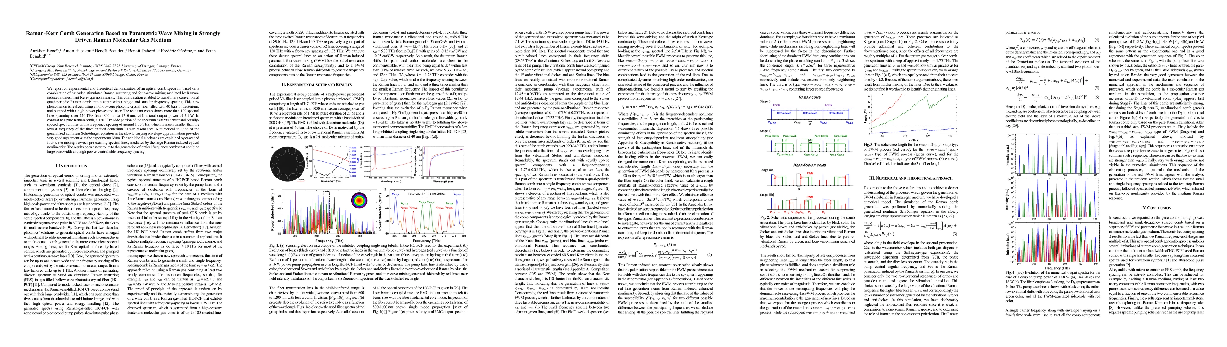 We report on experimental and theoretical demonstration of an optical comb spectrum based on a combination of cascaded stimulated Raman scattering and four-wave mixing mediated by Raman-induced nonresonant Kerr-type nonlinearity. This combination enabled to transform a conventional quasi-periodic Raman comb into a comb with a single and smaller frequency spacing. This new phenomenon is realized using a hollow-core photonic crystal fiber filled with 40 bars of deuterium, and pumped with a high-power picosecond laser. The resultant comb shows more than 100 spectral lines spanning over 220 THz from 800 nm to 1710 nm, with a total output power of 7.1 W. In contrast to a pure Raman comb, a 120 THz wide portion of the spectrum exhibits denser and equally-spaced spectral lines with a frequency spacing of around 1.75 THz, which is much smaller than the lowest frequency of the three excited deuterium Raman resonances. A numerical solution of the generalized nonlinear Schr\"odinger equation in the slowly varying envelope approximation provides very good agreement with the experimental data. The additional sidebands are explained by cascaded four-wave mixing between pre-existing spectral lines, mediated by the large Raman induced optical nonlinearity. The results open a new route to the generation of optical frequency combs that combine large bandwidth and high power controllable frequency spacing.