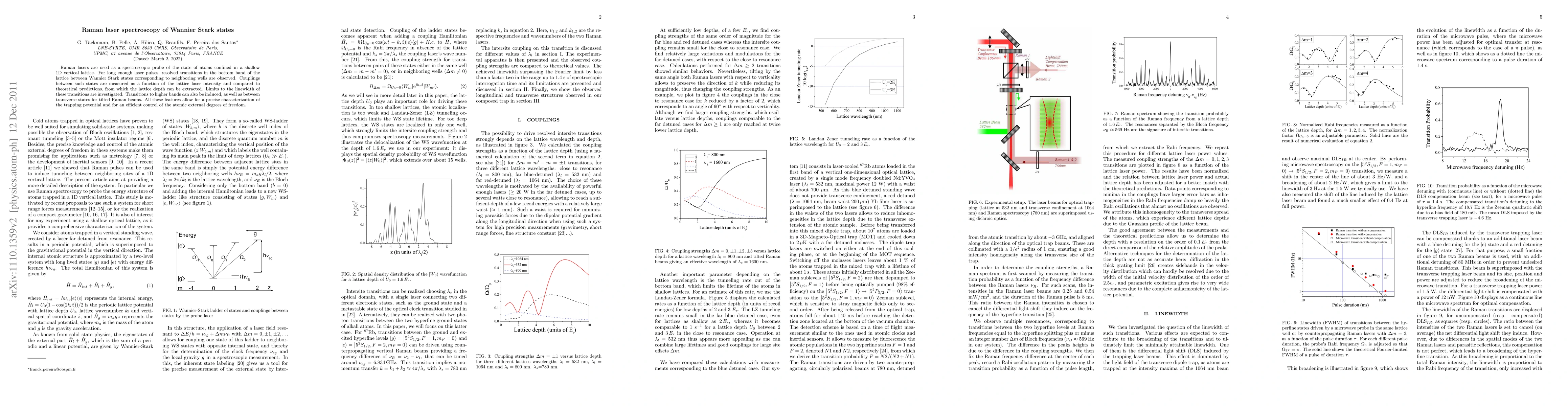 Raman lasers are used as a spectroscopic probe of the state of atoms confined in a shallow 1D vertical lattice. For long enough laser pulses, resolved transitions in the bottom band of the lattice between Wannier Stark states corresponding to neighboring wells are observed. Couplings between such states are measured as a function of the lattice laser intensity and compared to theoretical predictions, from which the lattice depth can be extracted. Limits to the linewidth of these transitions are investigated. Transitions to higher bands can also be induced, as well as between transverse states for tilted Raman beams. All these features allow for a precise characterization of the trapping potential and for an efficient control of the atoms external degrees of freedom.