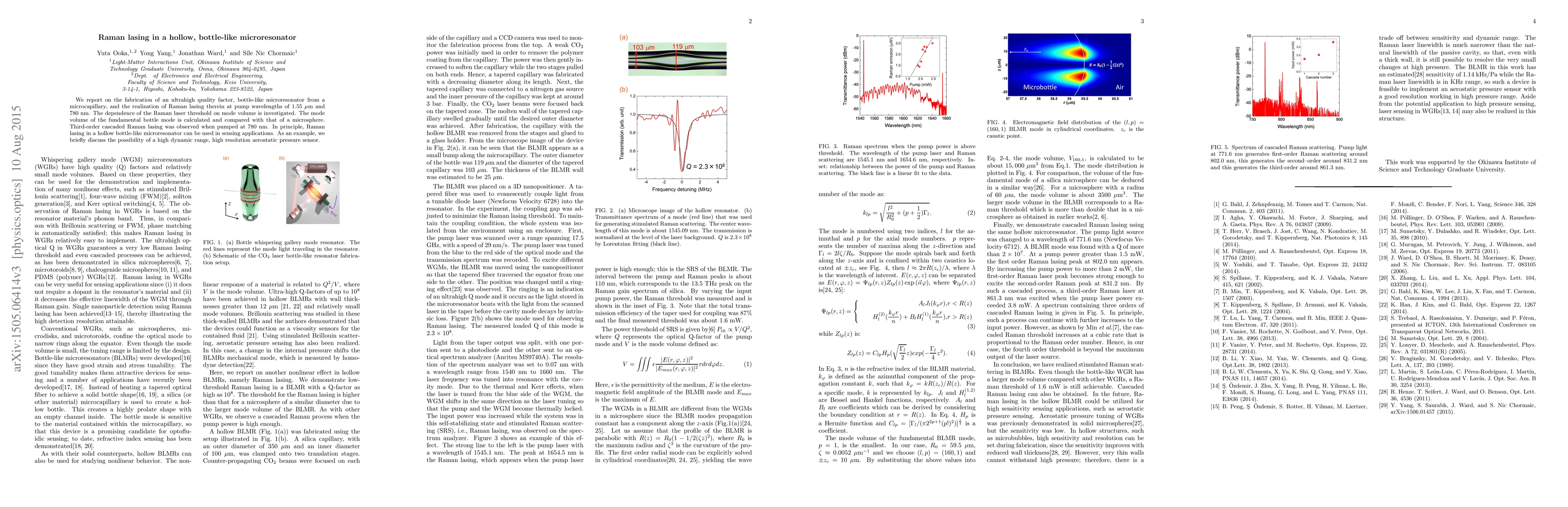 This paper details the creation of an ultrahigh quality factor bottle-like microresonator from a microcapillary, achieving Raman lasing at 1.55 μm and 780 nm, with a focus on the threshold dependency on mode volume. Third-order cascaded Raman lasing was observed at 780 nm, indicating potential for high dynamic range, high resolution sensing applications such as aerostatic pressure detection.