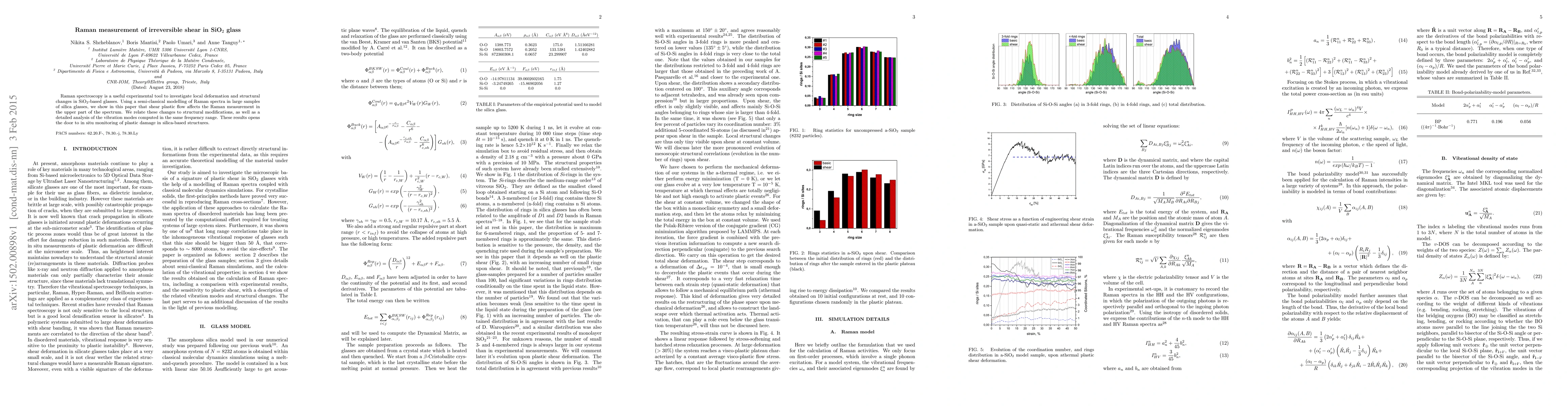 Raman spectroscopy is a useful experimental tool to investigate local deformation and structural changes in SiO$_2$-based glasses. Using a semi-classical modelling of Raman spectra in large samples of silica glasses, we show in this paper that shear plastic flow affects the Raman measurement in the upper part of the spectrum. We relate these changes to structural modifications, as well as a detailed analysis of the vibration modes computed in the same frequency range. These results opens the door to in situ monitoring of plastic damage in silica-based structures.