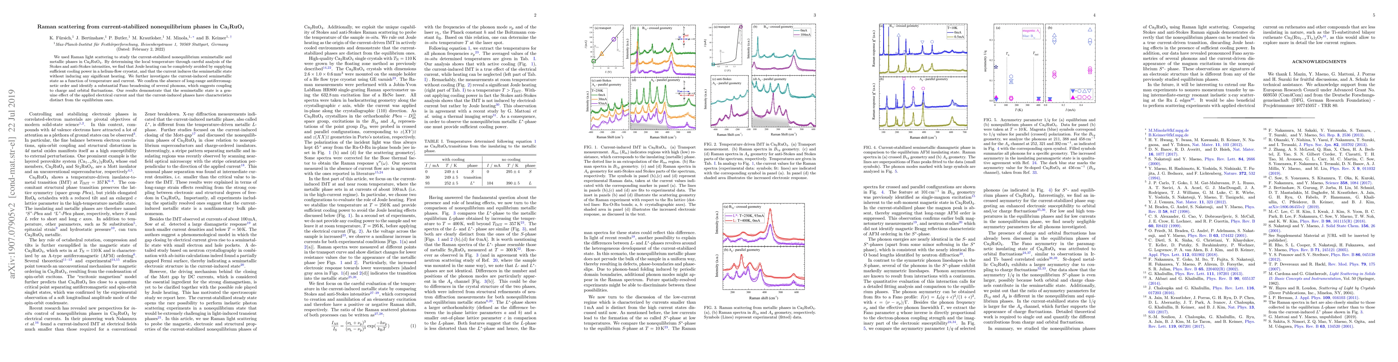 This study uses Raman scattering to explore current-stabiled nonequilibrium phases in Ca$_2$RuO$_4$, revealing that sufficient cooling can prevent Joule heating while inducing a semimetallic state without significant temperature rise. The research identifies distinct characteristics of current-induced phases, showing no long-range antiferromagnetic order and significant phonon broadening indicative of charge and orbital fluctuations.