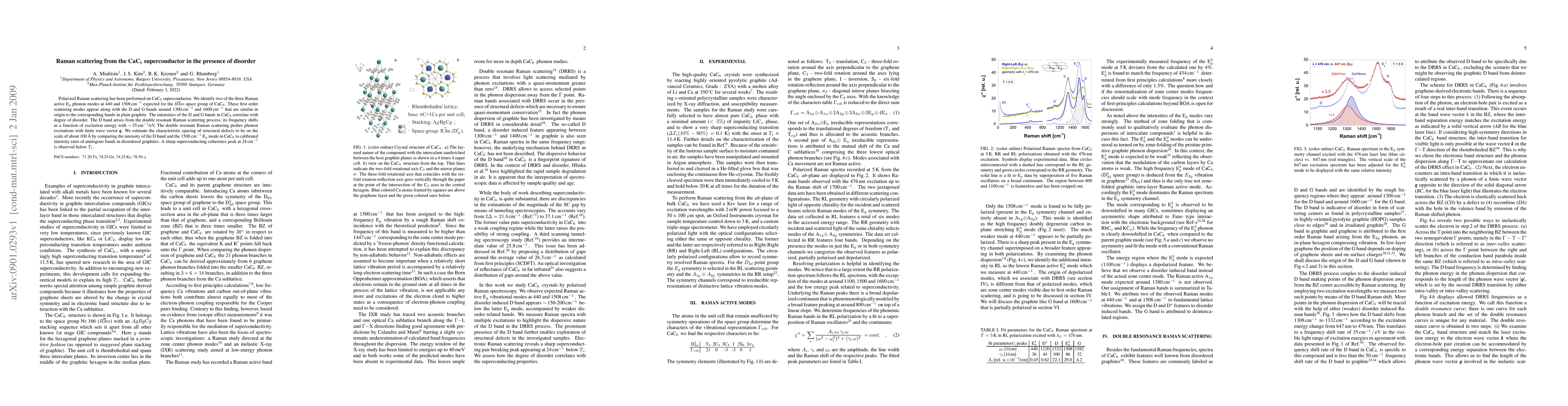 This study uses polarized Raman scattering to analyze CaC6 superconductor, identifying two Eg phonon modes and correlating the intensities of D and G bands with disorder levels. A superconducting coherence peak is observed, suggesting the influence of structural defects on superconductivity.