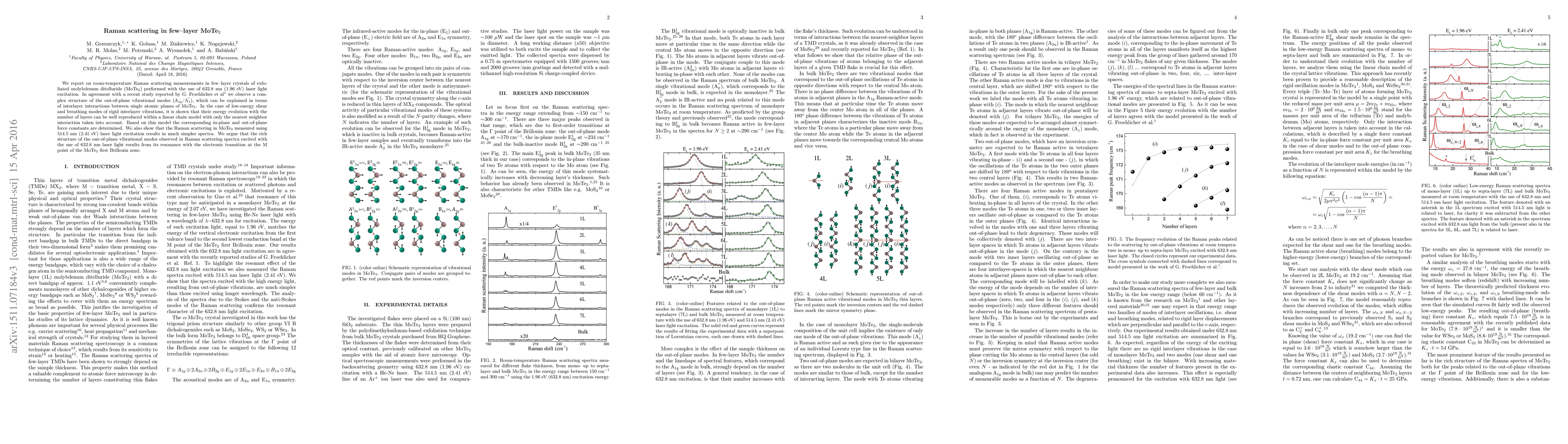 We report on room-temperature Raman scattering measurements in few-layer crystals of exfoliated molybdenum ditelluride (MoTe$_{2}$) performed with the use of 632.8 nm (1.96 eV) laser light excitation. In agreement with recent study reported by G. Froehlicher et al, (2015 $Nano$ $Lett.$ 15 6481) we observe a complex structure of the out-of-plane vibrational modes (A$_{1g}$/A$^{'}_{1}$), which can be explained in terms of interlayer interactions between single atomic planes of MoTe$_{2}$. In the case of low-energy shear and breathing modes of rigid interlayer vibrations it is shown that their energy evolution with the number of layers can be well reproduced within a linear chain model with only the nearest neighbor interaction taken into account. Based on this model the corresponding in-plane and out-of-plane force constants are determined. We also show that the Raman scattering in MoTe$_{2}$ measured using 514.5 nm (2.41 eV) laser light excitation results in much simpler spectra. We argue that the rich structure of the out-of-plane vibrational modes observed in Raman scattering spectra excited with the use of 632.8 nm laser light results from its resonance with the electronic transition at the M or K points of the MoTe$_{2}$ first Brillouin zone.