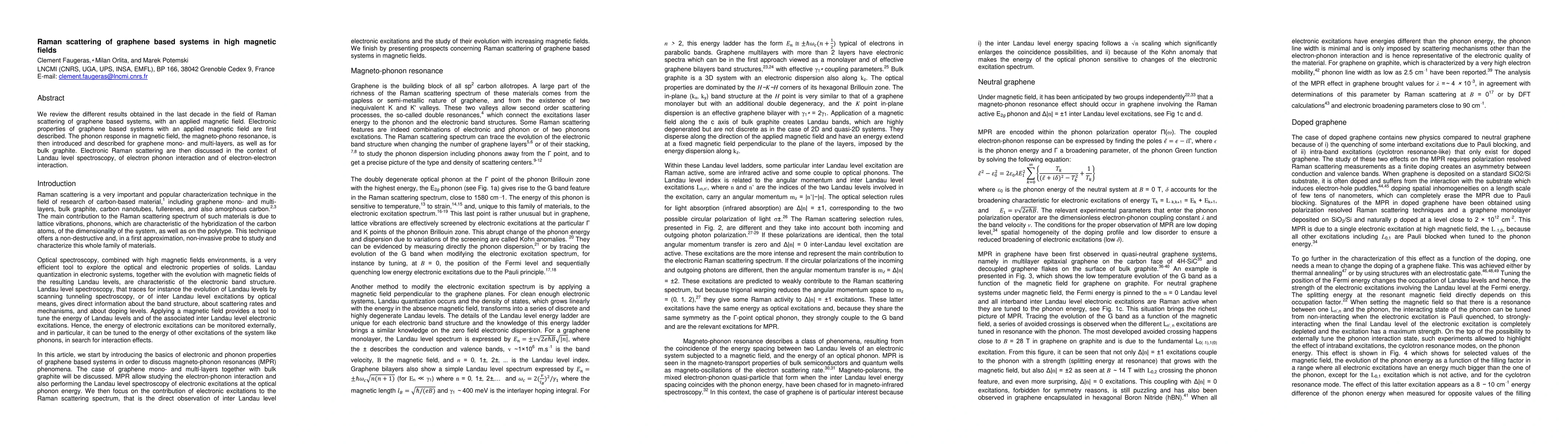 We review the different results obtained in the last decade in the field of Raman scattering of graphene based systems, with an applied magnetic field. Electronic properties of graphene based systems with an applied magnetic field will first be described. The phonon response in magnetic field, the magneto-phono resonance, will then be introduced and described in different systems, including graphene, multilayer graphene and bulk graphite. Electronic Raman scattering is then be discussed in the context of Landau level spectroscopy, of electron phonon interaction and of electron-electron interaction.