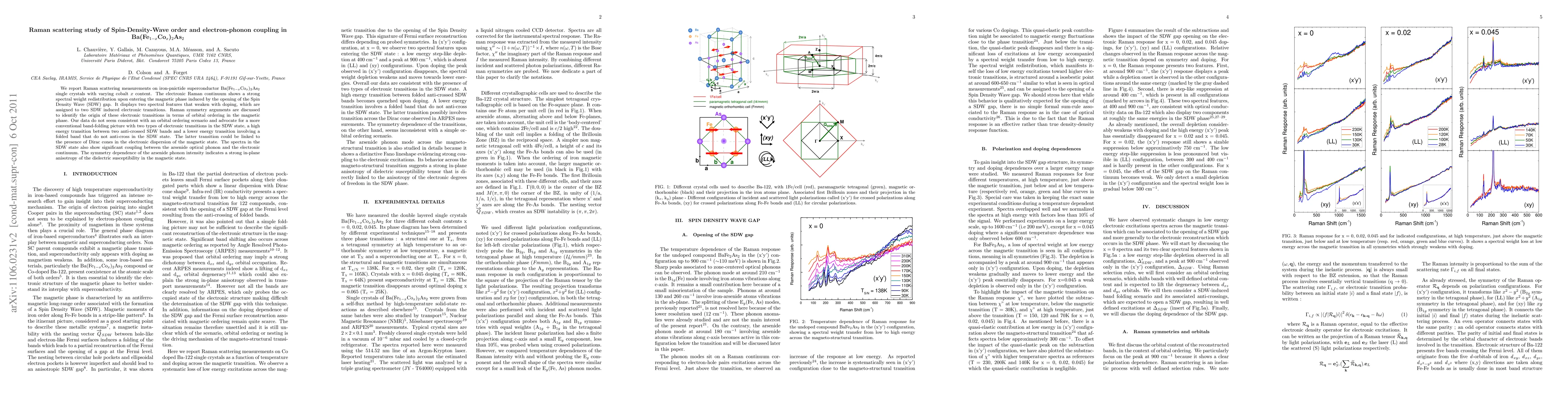 We report Raman scattering measurements on iron-pnictide superconductor Ba(Fe$_{1-x}$Co$_x$)$_2$As$_2$ single crystals with varying cobalt $x$ content. The electronic Raman continuum shows a strong spectral weight redistribution upon entering the magnetic phase induced by the opening of the Spin Density Wave (SDW) gap. It displays two spectral features that weaken with doping, which are assigned to two SDW induced electronic transitions. Raman symmetry arguments are discussed to identify the origin of these electronic transitions in terms of orbital ordering in the magnetic phase. Our data do not seem consistent with an orbital ordering scenario and advocate for a more conventional band-folding picture with two types of electronic transitions in the SDW state, a high energy transition between two anti-crossed SDW bands and a lower energy transition involving a folded band that do not anti-cross in the SDW state. The latter transition could be linked to the presence of Dirac cones in the electronic dispersion of the magnetic state. The spectra in the SDW state also show significant coupling between the arsenide optical phonon and the electronic continuum. The symmetry dependence of the arsenide phonon intensity indicates a strong in-plane anisotropy of the dielectric susceptibility in the magnetic state.