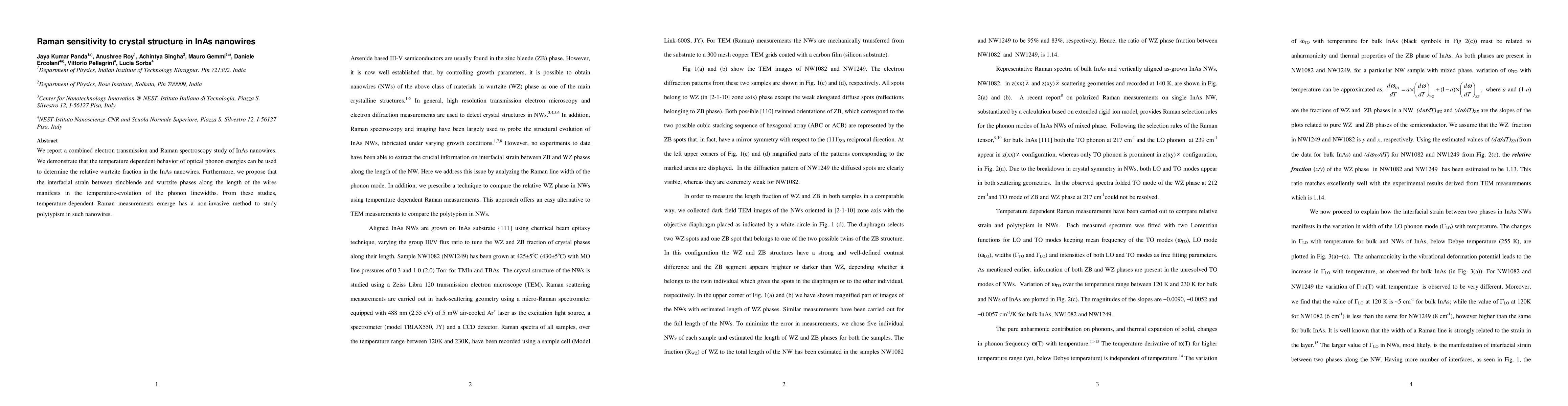 We report a combined electron transmission and Raman spectroscopy study of InAs nanowires. We demonstrate that the temperature dependent behavior of optical phonon energies can be used to determine the relative wurtzite fraction in the InAs nanowires. Furthermore, we propose that the interfacial strain between zincblende and wurtzite phases along the length of the wires manifests in the temperature-evolution of the phonon linewidths. From these studies, temperature-dependent Raman measurements emerge has a non-invasive method to study polytypism in such nanowires.
