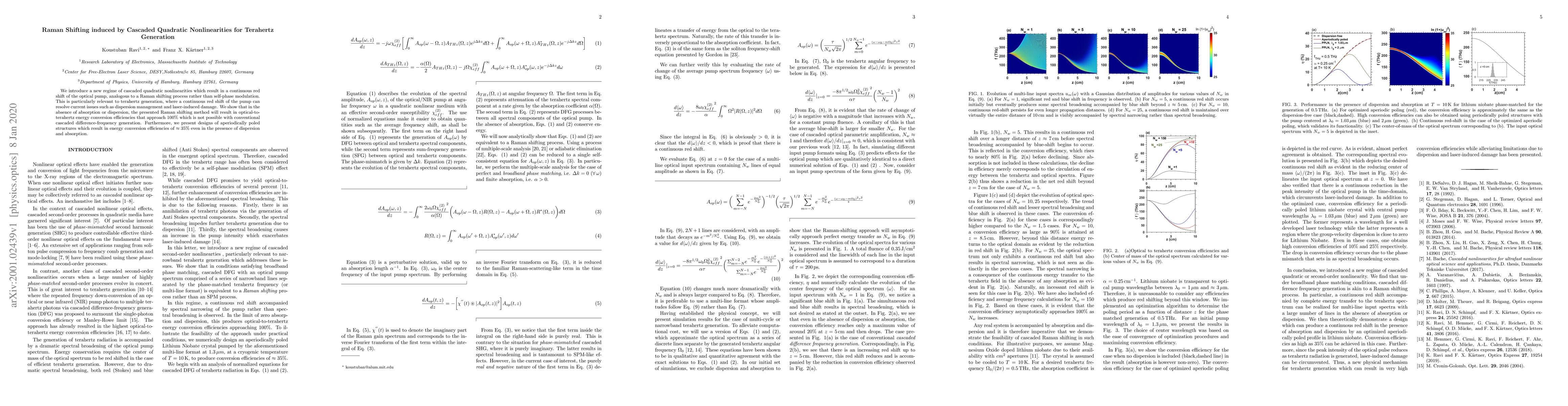 This paper proposes a novel method of terahertz generation using cascaded quadratic nonlinearities that induce Raman shifting, achieving near-perfect optical-to-terahertz conversion efficiencies and addressing issues like dispersion management and laser damage. The method also demonstrates practical efficiencies of around 35% in real-world conditions.
