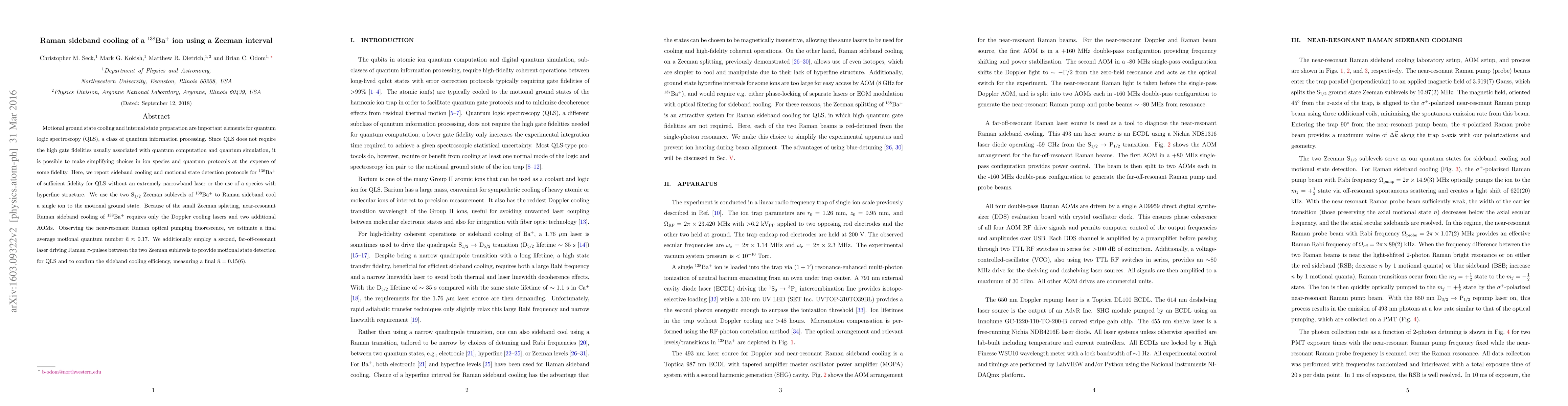 Researchers demonstrate Raman sideband cooling of a single $^{138}$Ba$^+$ ion to near-motional ground state using just the Doppler cooling lasers and two additional AOMs, with an estimated average motional quantum number of $ar{n} imes 0.17$.