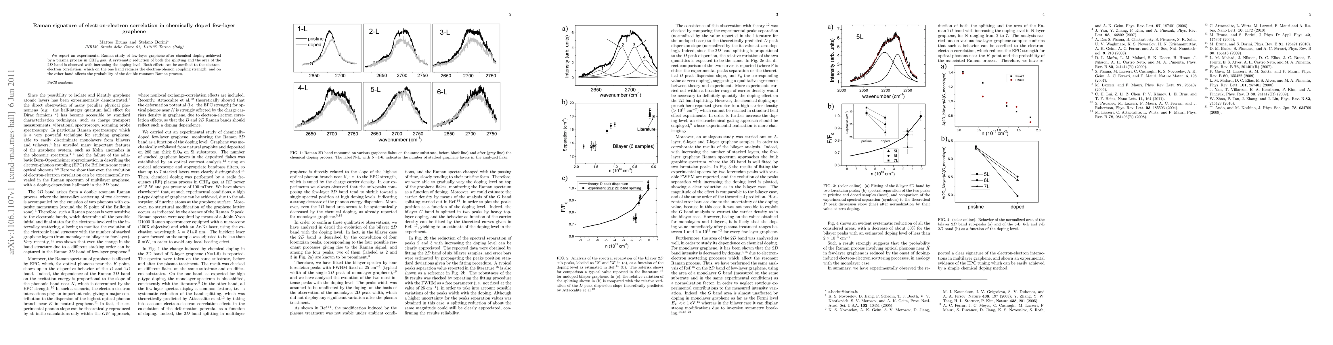 We report an experimental Raman study of few-layer graphene after chemical doping achieved by a plasma process in CHF$_3$ gas. A systematic reduction of both the splitting and the area of the 2D band is observed with increasing the doping level. Both effects can be ascribed to the electron-electron correlation, which on the one hand reduces the electron-phonon coupling strength, and on the other hand affects the probability of the double resonant Raman process.