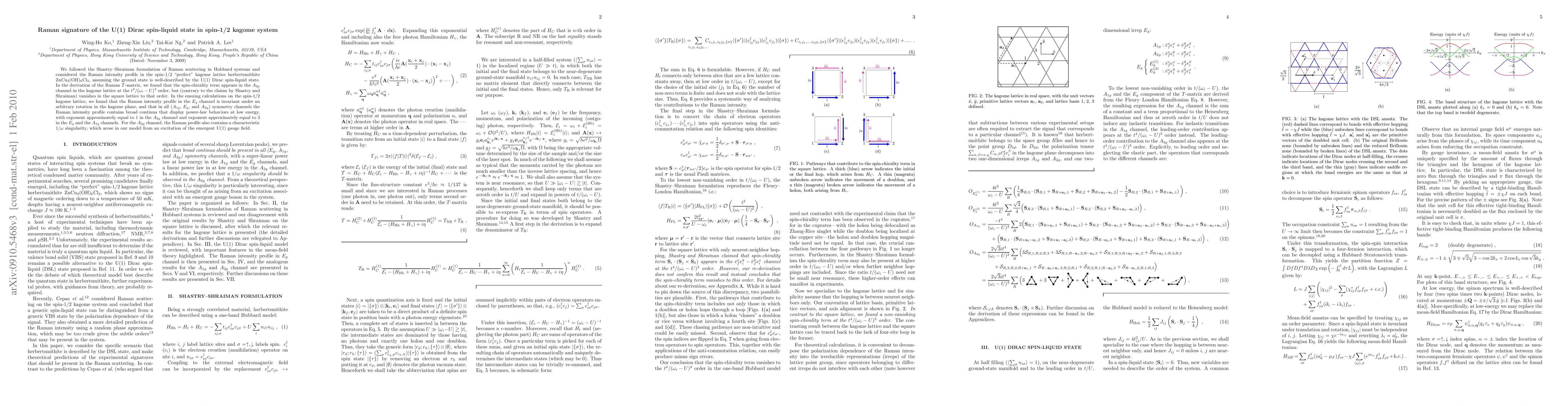 This paper investigates the Raman scattering signature of the U(1) Dirac spin-liquid state in the spin-1/2 kagome system herbertsmithite using the Shastry-Shraiman formulation. The study reveals that the Raman intensity profile exhibits broad continua with power-law behaviors and a characteristic 1/\omega singularity in the A_{2g} channel, indicating the presence of an emergent U(1) gauge field.