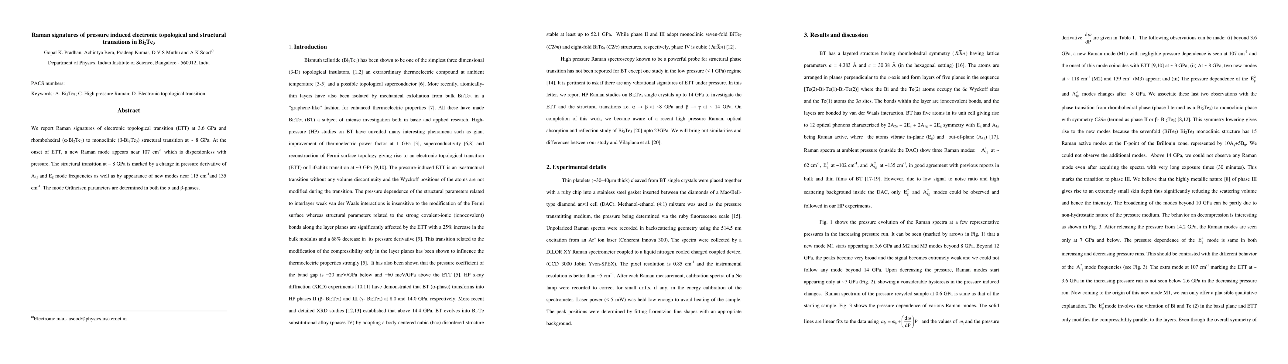 This paper investigates Raman signatures of pressure-induced transitions in Bi2Te3, revealing an electronic topological transition at 3.6 GPa marked by a new dispersionless Raman mode near 107 cm-1, and a structural transition at ~8 GPa characterized by changes in A1g and Eg mode frequencies and the appearance of new modes near 115 cm-1 and 135 cm-1.