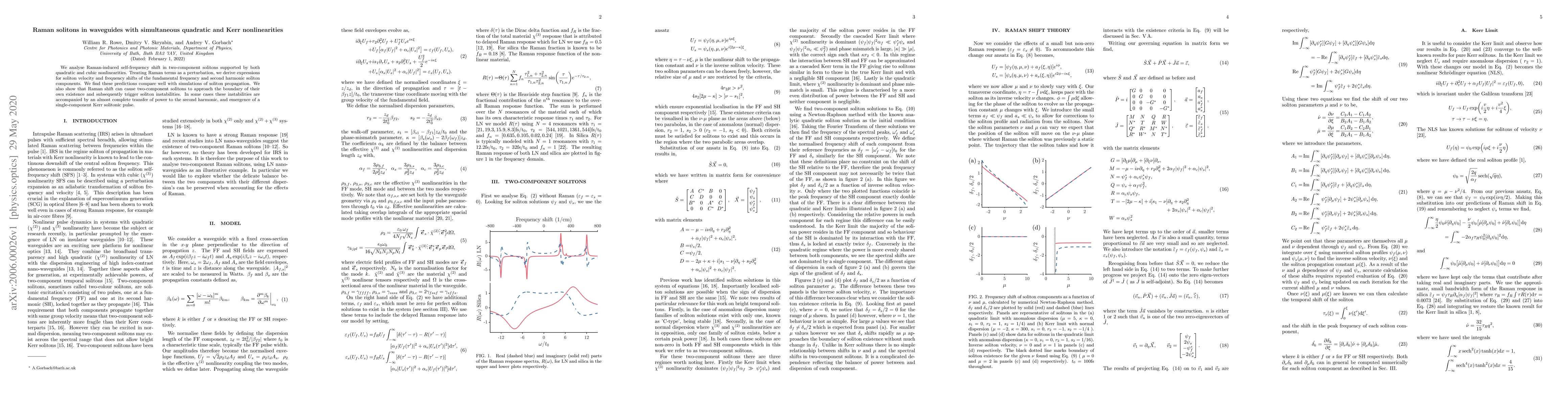 This paper investigates Raman solitons in waveguides with combined quadratic and Kerr nonlinearities, deriving expressions for soliton velocity and frequency shifts. It finds that Raman-induced shifts can destabilize two-component solitons, leading to power transfer to the second harmonic and the emergence of single-component Kerr solitons.