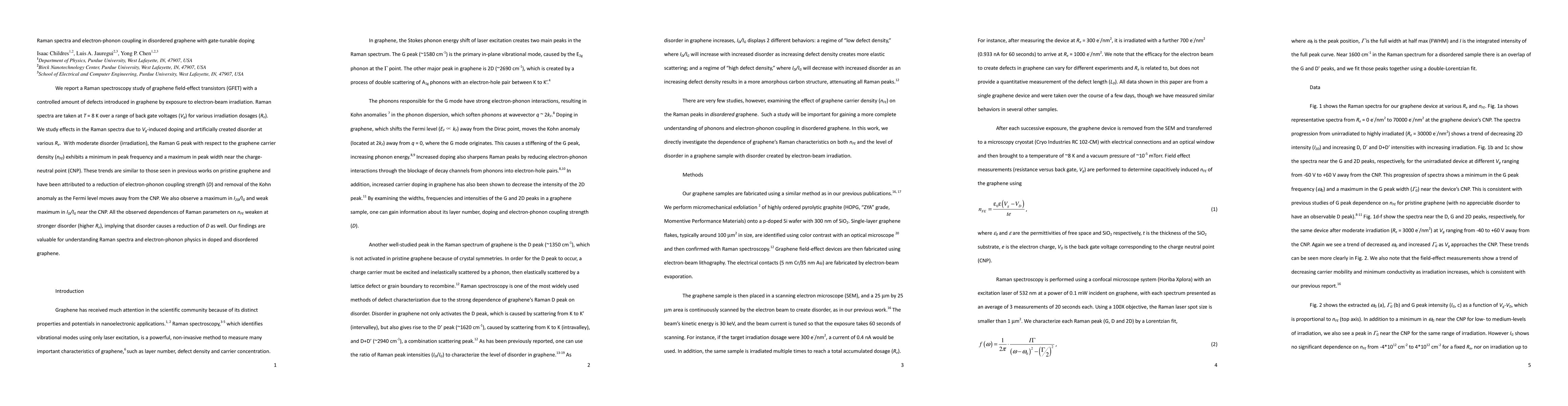We report a Raman spectroscopy study of graphene field-effect transistors (GFET) with a controlled amount of defects introduced in graphene by exposure to electron-beam irradiation. Raman spectra are taken at T = 8 K over a range of back gate voltages (Vg) for various irradiation dosages (Re). We study effects in the Raman spectra due to Vg-induced doping and artificially created disorder at various Re. With moderate disorder (irradiation), the Raman G peak with respect to the graphene carrier density (nFE) exhibits a minimum in peak frequency and a maximum in peak width near the charge- neutral point (CNP). These trends are similar to those seen in previous works on pristine graphene and have been attributed to a reduction of electron-phonon coupling strength (D) and removal of the Kohn anomaly as the Fermi level moves away from the CNP. We also observe a maximum in I2D/IG and weak maximum in ID/IG near the CNP. All the observed dependences of Raman parameters on nFE weaken at stronger disorder (higher Re), implying that disorder causes a reduction of D as well. Our findings are valuable for understanding Raman spectra and electron-phonon physics in doped and disordered graphene.