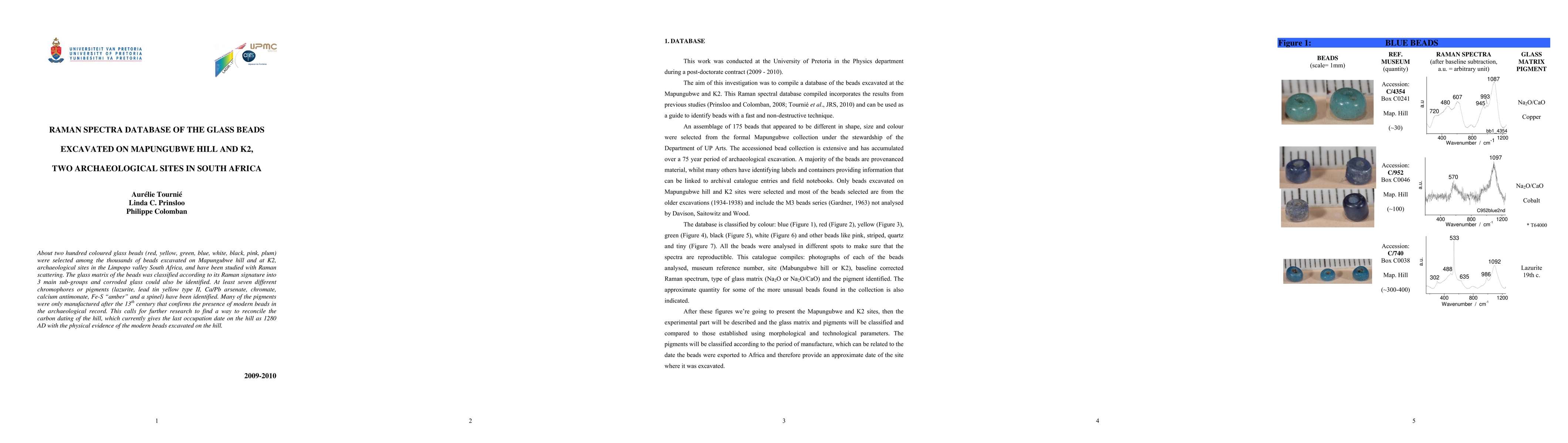 About two hundred coloured glass beads (red, yellow, green, blue, white, black, pink, plum) were selected among the thousands of beads excavated on Mapungubwe hill and at K2, archaeological sites in the Limpopo valley South Africa, and have been studied with Raman scattering. The glass matrix of the beads was classified according to its Raman signature into 3 main sub-groups and corroded glass could also be identified. At least seven different chromophores or pigments (lazurite, lead tin yellow type II, Ca/Pb arsenate, chromate, calcium antimonate, Fe-S "amber" and a spinel) have been identified. Many of the pigments were only manufactured after the 13th century that confirms the presence of modern beads in the archaeological record. This calls for further research to find a way to reconcile the carbon dating of the hill, which currently gives the last occupation date on the hill as 1280 AD with the physical evidence of the modern beads excavated on the hill.