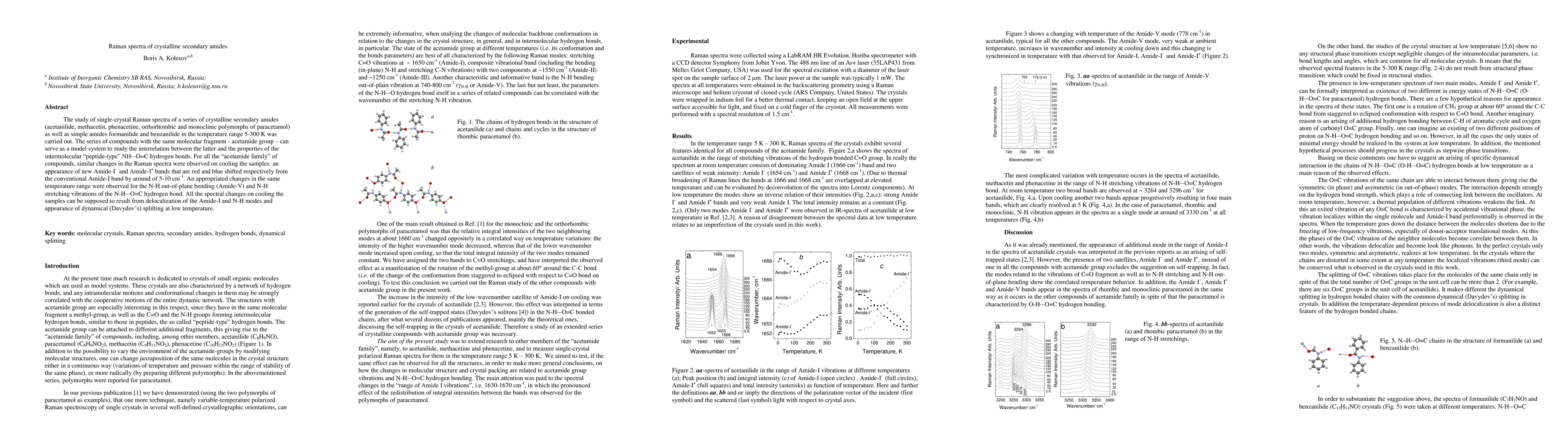 The study of single-crystal Raman spectra of a series of crystalline secondary amides (acetanilide, methacetin, phenacetine, orthorhombic and monoclinic polymorphs of paracetamol) as well as simple amides formanilide and benzanilide in the temperature range 5-300 K was carried out. The series of compounds with the same molecular fragment, i.e. acetamide group, can serve as a model system to study the interrelation between the latter and the properties of the intermolecular "peptide-type" NH...O=C hydrogen bonds. For all the "acetamide family" of compounds, similar changes in the Raman spectra were observed on cooling the samples: an appearance of new Amide I(-) and Amide I(+) bands that are red and blue shifted respectively from the conventional Amide I band by around of 5-10 inverse centimeters. An appropriated changes in the same temperature range were observed for the N-H out-of-plane bending (Amide V) and N-H stretching vibrations of the N-H...O=C hydrogen bond. All the spectral changes on cooling the samples can be supposed to result from delocalization of the Amide I and N-H modes and appearance of dynamical splitting at low temperature.