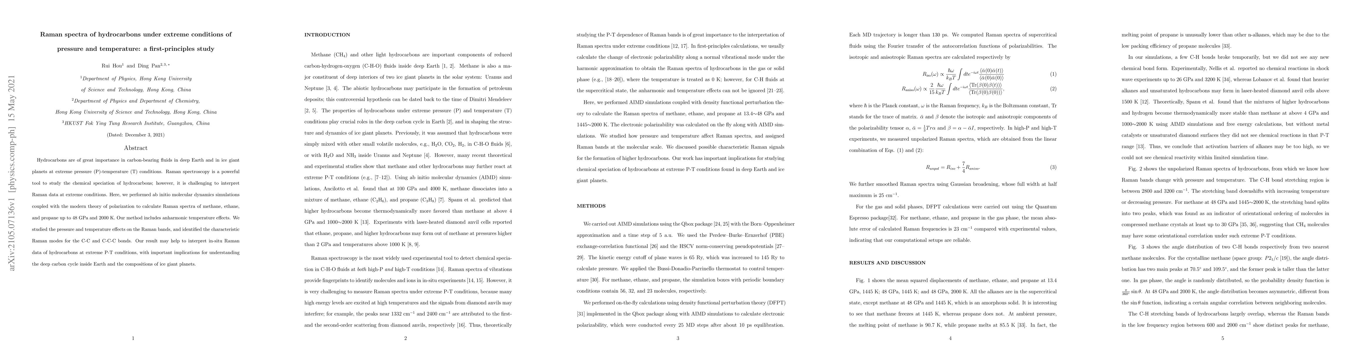 Hydrocarbons are of great importance in carbon-bearing fluids in deep Earth and in ice giant planets at extreme pressure (P)-temperature (T) conditions. Raman spectroscopy is a powerful tool to study the chemical speciation of hydrocarbons; however, it is challenging to interpret Raman data at extreme conditions. Here, we performed ab initio molecular dynamics simulations coupled with the modern theory of polarization to calculate Raman spectra of methane, ethane, and propane up to 48 GPa and 2000 K. Our method includes anharmonic temperature effects. We studied the pressure and temperature effects on the Raman bands, and identified the characteristic Raman modes for the C-C and C-C-C bonds. Our result may help to interpret in-situ Raman data of hydrocarbons at extreme P-T conditions, with important implications for understanding the deep carbon cycle inside Earth and the compositions of ice giant planets.