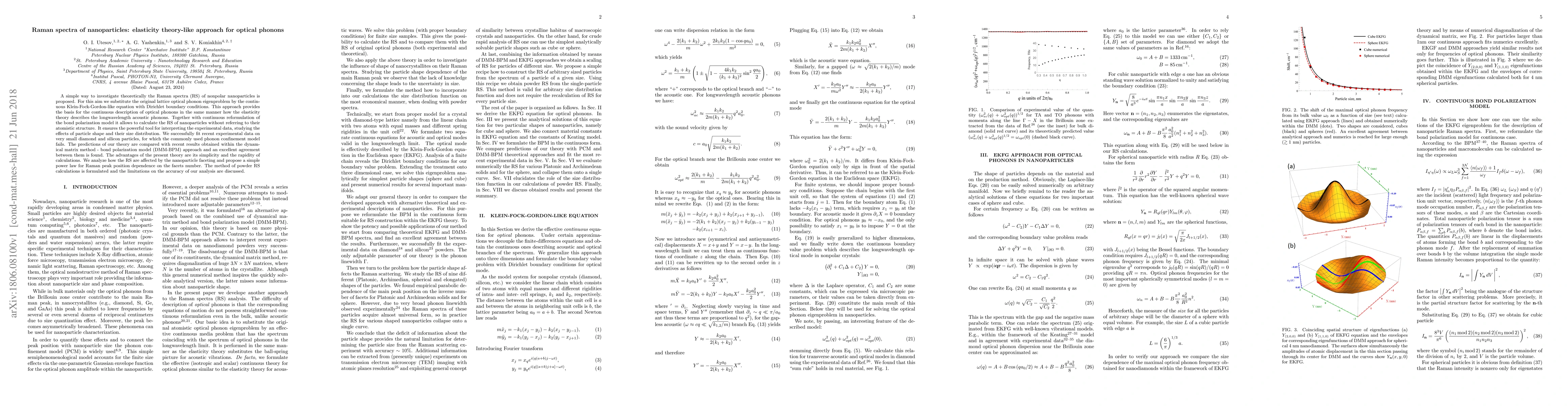 A simple way to investigate theoretically the Raman spectra (RS) of nonpolar nanoparticles is proposed. For this aim we substitute the original lattice optical phonon eigenproblem by the continuous Klein-Fock-Gordon-like equation with Dirichlet boundary conditions. This approach provides the basis for the continuous description of optical phonons in the same manner how the elasticity theory describes the longwavelength acoustic phonons. Together with continuous reformulation of the bond polarization model it allows to calculate the RS of nanoparticles without referring to their atomistic structure. It ensures the powerful tool for interpreting the experimental data, studying the effects of particle shape and their size distribution. We successfully fit recent experimental data on very small diamond and silicon particles, for which the commonly used phonon confinement model fails. The predictions of our theory are compared with recent results obtained within the dynamical matrix method - bond polarization model (DMM-BPM) approach and an excellent agreement between them is found. The advantages of the present theory are its simplicity and the rapidity of calculations. We analyze how the RS are affected by the nanoparticle faceting and propose a simple power law for Raman peak position dependence on the facets number. The method of powder RS calculations is formulated and the limitations on the accuracy of our analysis are discussed.