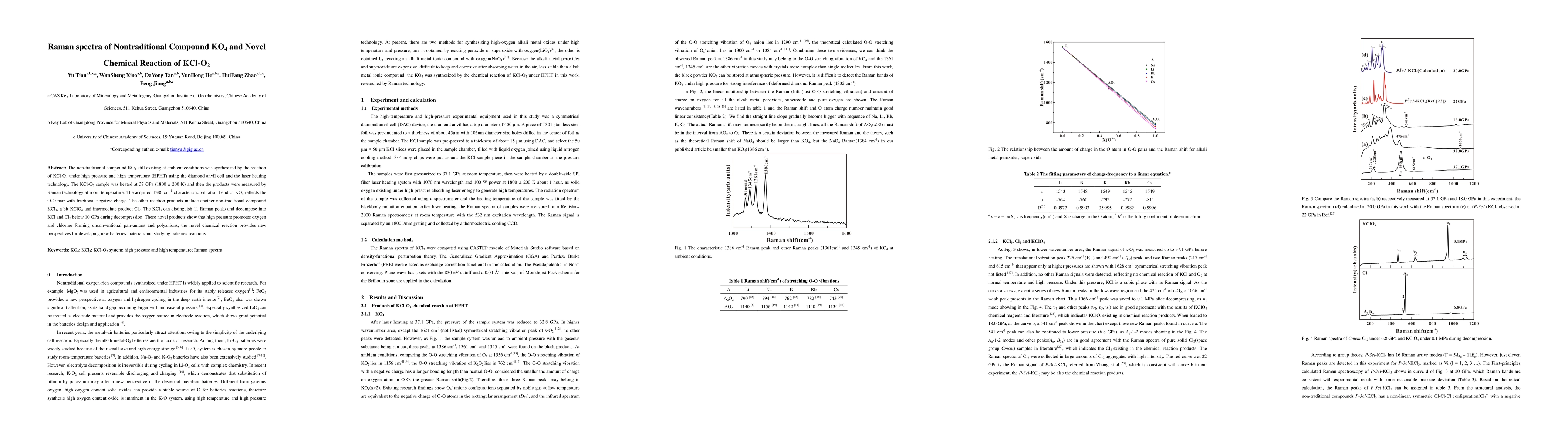 The non-traditional compound KO4 still existing at ambient conditions was synthesized by the reaction of KCl-O2 under high pressure and high temperature (HPHT) using the diamond anvil cell and the laser heating technology. The KCl-O2 sample was heated at 37 GPa (1800 K) and then the products were measured by Raman technology at room temperature. The acquired 1386 cm-1 characteristic vibration band of KO4 reflects the O-O pair with fractional negative charge. The other reaction products include another non-traditional compound KCl3, a bit KClO4 and intermediate product Cl2. The KCl3 can distinguish 11 Raman peaks and decompose into KCl and Cl2 below 10 GPa during decompression. These novel products show that high pressure promotes oxygen and chlorine forming unconventional pair-anions and polyanions, the novel chemical reaction provides new perspectives for developing new batteries materials and studying batteries reactions.