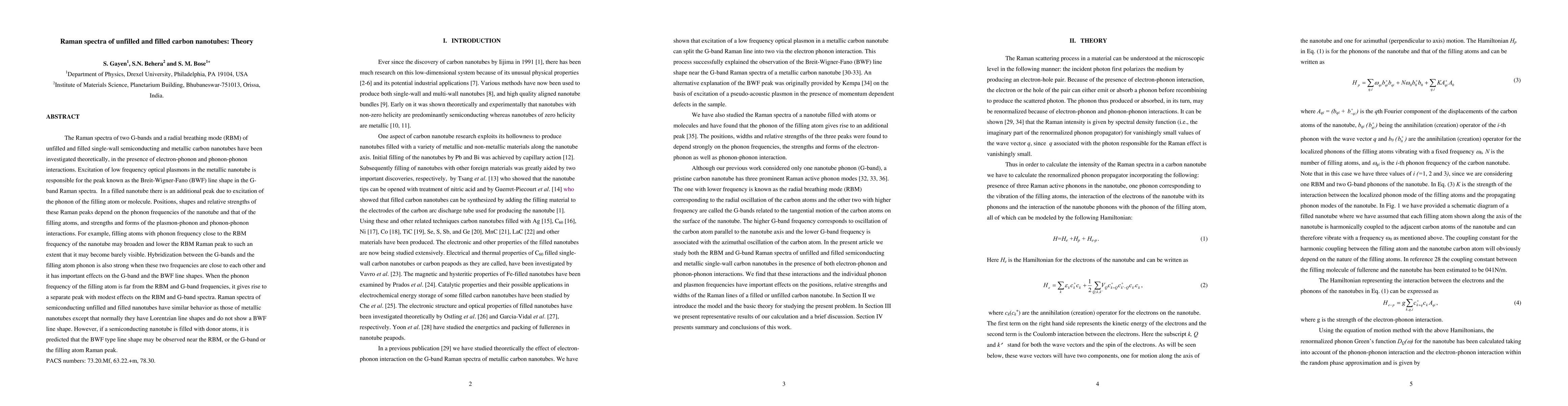The Raman spectra of two G-bands and a radial breathing mode (RBM) of unfilled and filled single-wall semiconducting and metallic carbon nanotubes have been investigated theoretically, in the presence of electron-phonon and phonon-phonon interactions. Excitation of low frequency optical plasmons in the metallic nanotube is responsible for the peak known as the Breit-Wigner-Fano (BWF) line shape in the G-band Raman spectra. In a filled nanotube there is an additional peak due to excitation of the phonon of the filling atom or molecule. Positions, shapes and relative strengths of these Raman peaks depend on the phonon frequencies of the nanotube and that of the filling atoms, and strengths and forms of the plasmon-phonon and phonon-phonon interactions. For example, filling atoms with phonon frequency close to the RBM frequency of the nanotube may broaden and lower the RBM Raman peak to such an extent that it may become barely visible. Hybridization between the G-bands and the filling atom phonon is also strong when these two frequencies are close to each other and it has important effects on the G-band and the BWF line shapes. When the phonon frequency of the filling atom is far from the RBM and G-band frequencies, it gives rise to a separate peak with modest effects on the RBM and G-band spectra. Raman spectra of semiconducting unfilled and filled nanotubes have similar behavior as those of metallic nanotubes except that normally they have Lorentzian line shapes and do not show a BWF line shape. However, if a semiconducting nanotube is filled with donor atoms, it is predicted that the BWF type line shape may be observed near the RBM, or the G-band or the filling atom Raman peak.