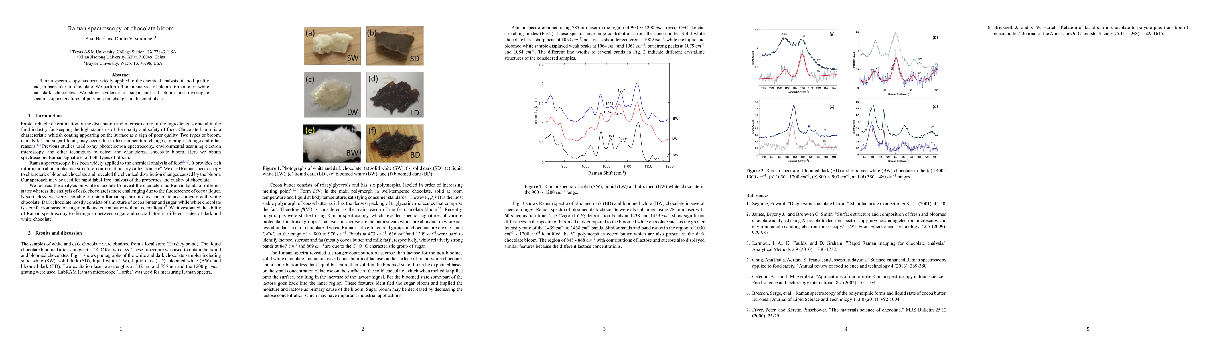 Raman spectroscopy has been widely applied to the chemical analysis of food quality and, in particular, of chocolate. We perform Raman analysis of bloom formation in white and dark chocolates. We show evidence of sugar and fat bloom and investigate spectroscopic signatures of polymorphic changes in different phases.