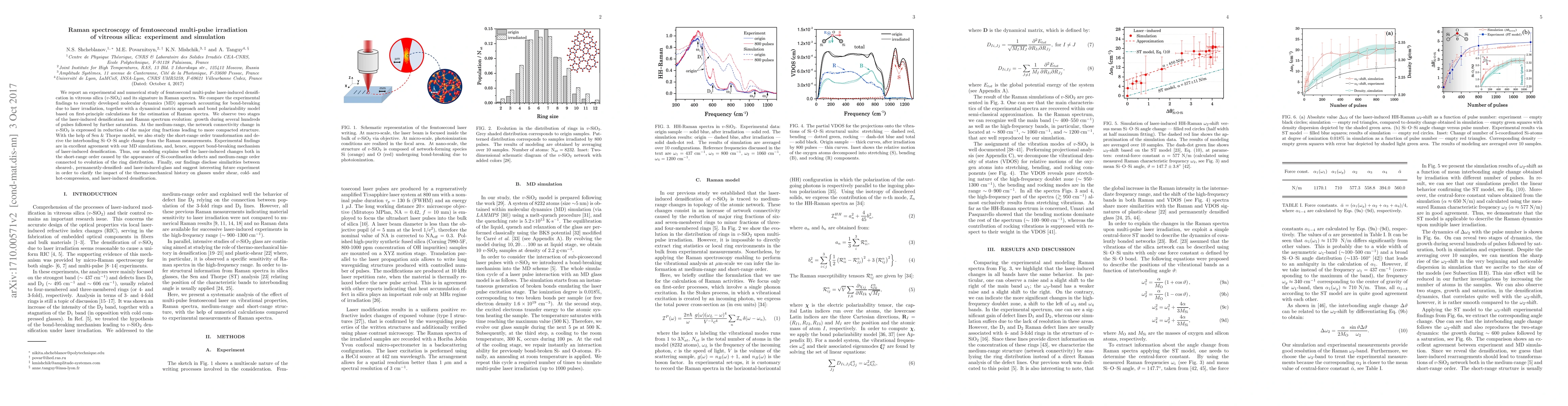 This paper investigates the densification of vitreous silica under femtosecond multi-pulse laser irradiation through Raman spectroscopy, comparing experimental results with molecular dynamics simulations. The study reveals two stages of densification and structural changes, supported by simulations, indicating a bond-breaking mechanism.