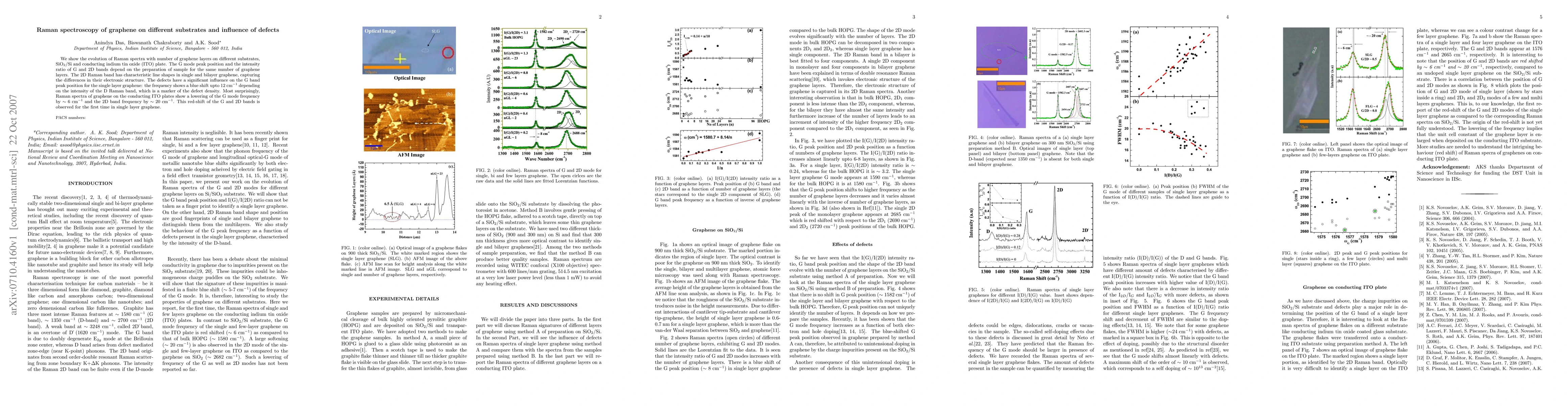 This study investigates the Raman spectra of graphene on various substrates, revealing that the G mode peak position and the intensity ratio of G and 2D bands vary with substrate and the number of graphene layers. Defects notably shift the G band frequency in single-layer graphene, while graphene on conducting ITO plates exhibits a previously unreported red-shift in both G and 2D bands.