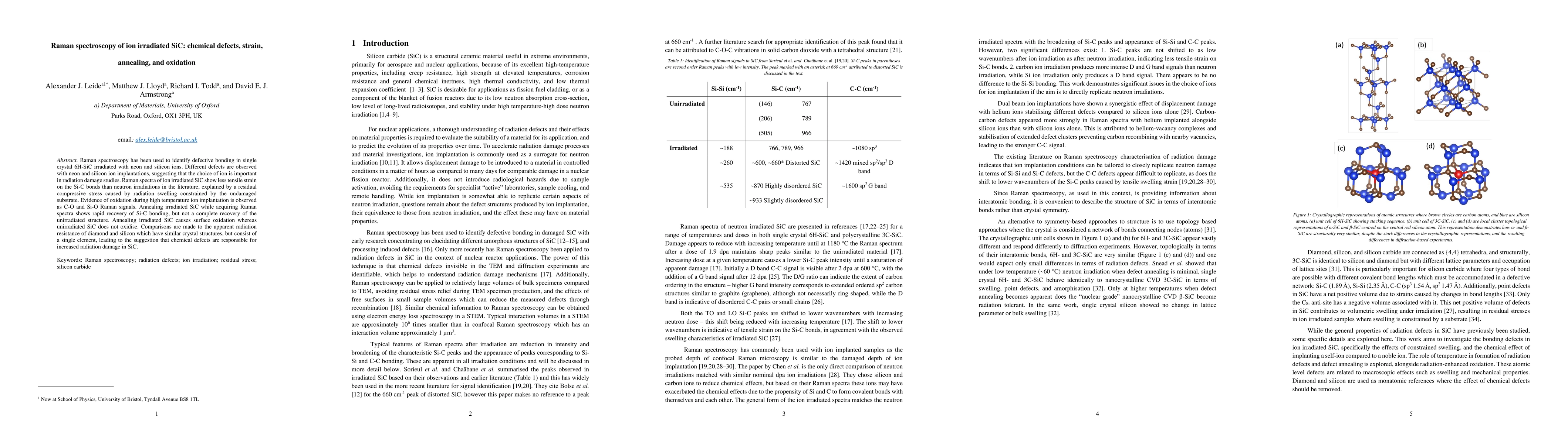 Raman spectroscopy has been used to identify defective bonding in neon and silicon ion irradiated single crystals of 6H-SiC. Observable differences exist in the C-C bonding region corresponding to different defect structures for neon and silicon ion implantations. Raman spectra of ion irradiated SiC show less tensile strain than neutron irradiations, explained by a residual compressive stress caused by the swelling constrained by the undamaged substrate. Evidence of oxidation during high temperature ion implantation is observed as C-O and Si-O Raman signals. Annealing irradiated SiC while acquiring Raman spectra shows rapid recovery of Si-C bonding, but not a complete recovery of the unirradiated structure. Annealing irradiated SiC causes surface oxidation where unirradiated SiC does not oxidise. Comparisons are made to the apparent radiation resistance of diamond and silicon which have similar crystal structures, but are monatomic, leading to the suggestion that chemical defects are responsible for increased radiation damage in SiC.