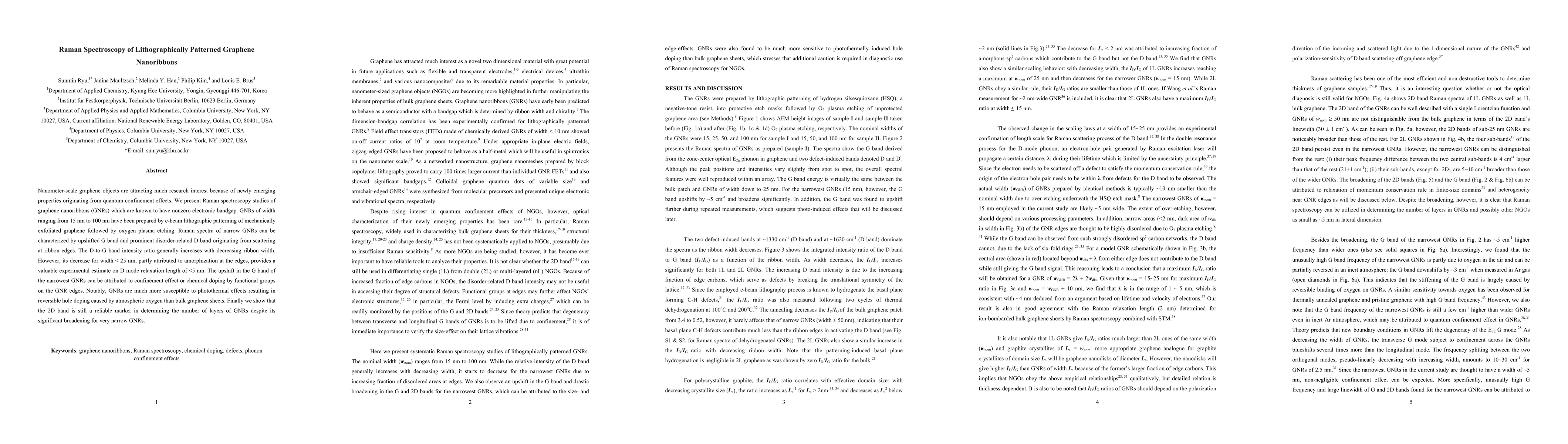 This study uses Raman spectroscopy to analyze graphene nanoribbons (GNRs) patterned via lithography, revealing upshifted G bands and increased D-to-G intensity ratios as ribbon width decreases, indicating edge effects and quantum confinement. The susceptibility of GNRs to photothermal effects and atmospheric oxygen highlights their unique doping characteristics compared to bulk graphene.