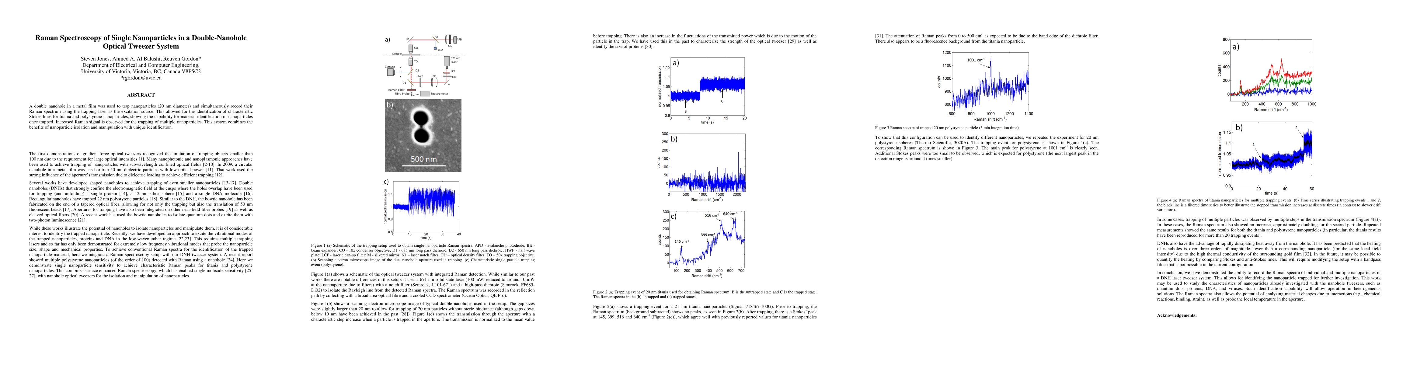 This study employs a double-nanohole optical tweezer to trap and analyze single nanoparticles, capturing their Raman spectra for material identification. The system enhances Raman signals for multiple trapped nanoparticles, demonstrating effective isolation and identification.