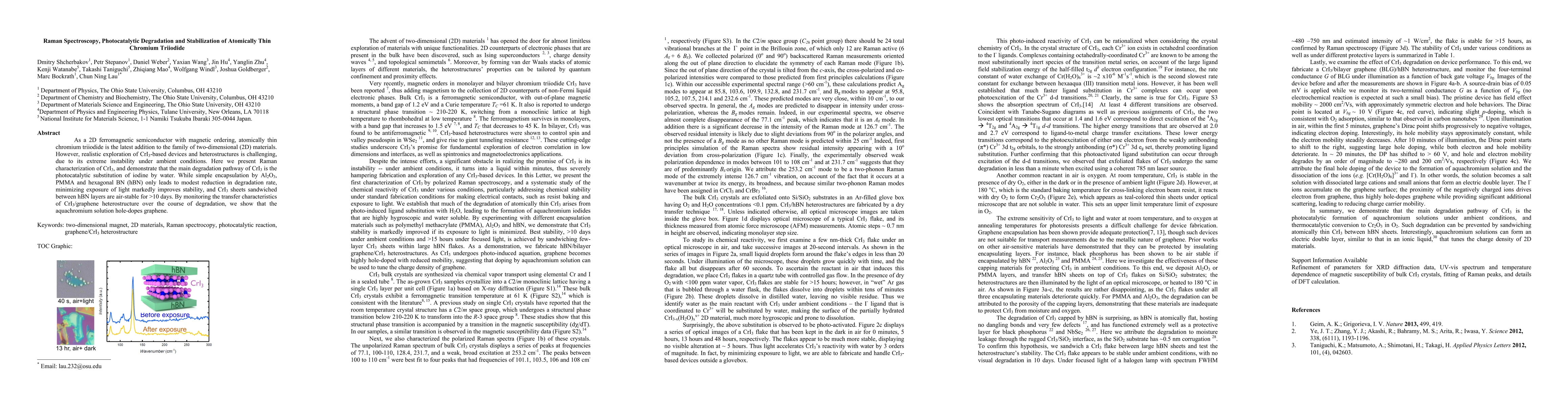 As a 2D ferromagnetic semiconductor with magnetic ordering, atomically thin chromium triiodide is the latest addition to the family of two-dimensional (2D) materials. However, realistic exploration of CrI3-based devices and heterostructures is challenging, due to its extreme instability under ambient conditions. Here we present Raman characterization of CrI3, and demonstrate that the main degradation pathway of CrI3 is the photocatalytic substitution of iodine by water. While simple encapsulation by Al2O3, PMMA and hexagonal BN (hBN) only leads to modest reduction in degradation rate, minimizing exposure of light markedly improves stability, and CrI3 sheets sandwiched between hBN layers are air-stable for >10 days. By monitoring the transfer characteristics of CrI3/graphene heterostructure over the course of degradation, we show that the aquachromium solution hole-dopes graphene.