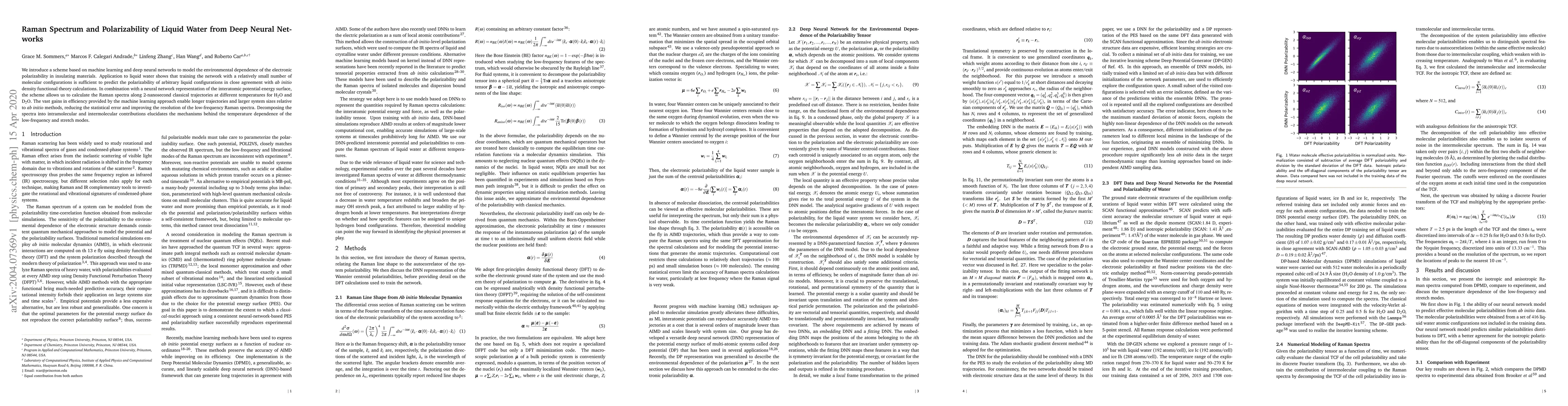 This paper employs deep neural networks to model the polarizability of liquid water, achieving predictions that closely match ab initio calculations. The machine learning approach enables efficient calculation of Raman spectra over long timescales, providing insights into the temperature-dependent mechanisms of low-frequency and stretch modes.