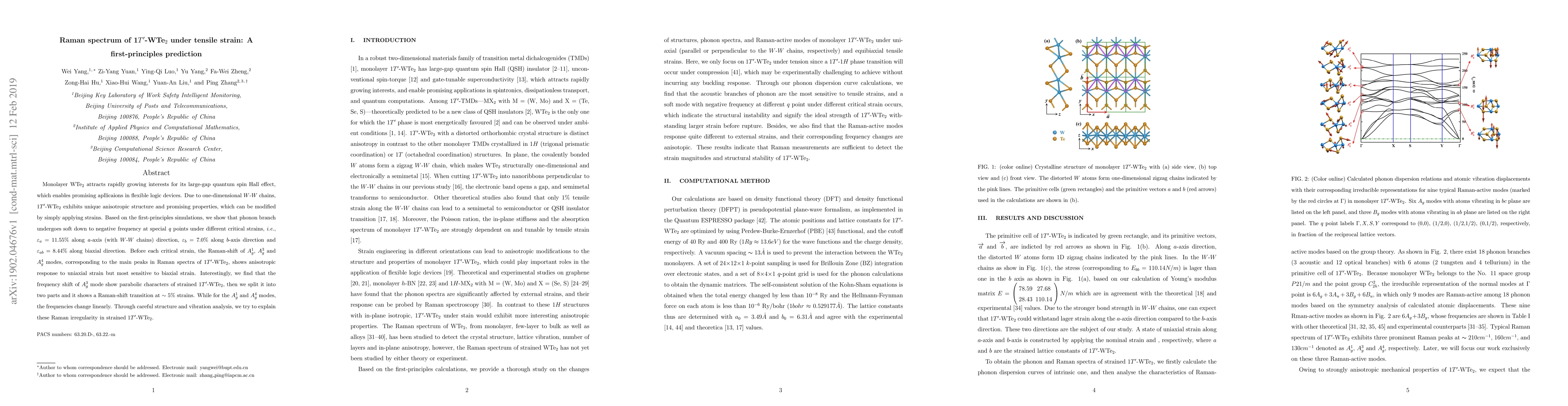 Monolayer WTe2 attracts rapidly growing interests for its large-gap quantum spin Hall effect,which enables promising apllications in flexible logic devices. Due to one-dimensional W-W chains,1T'-WTe2 exhibits unique anisotropic structure and promising properties, which can be modified by simply applying strains. Based on the first-principles simulations, we show that phonon branch undergoes soft down to negative frequency at special q points under different critical strains, i.e., epsilon_a = 11.55 percent along a-axis (with W-W chains) direction, epsilon_b = 7.0 percent along b-axis direction and epsilon_ab = 8.44 percent along biaxial direction. Before each critical strain, the Raman-shift of A1_g, A3_g, and A4_g modes, corresponding to the main peaks in Raman spectra of 1T'-WTe2 , shows anisotropic response to uniaxial strain but most sensitive to biaxial strain. Interestingly, we find that the frequency shift of A3_g mode show parabolic characters of strained 1T'-WTe2, then we split it into two parts and it shows a Raman-shift transition at about 5 percent strains. While for the A1_g and A4_g modes,the frequencies change linearly. Through careful structure and vibration analysis, we try to explain these Raman irregularity in strained 1T'-WTe2.