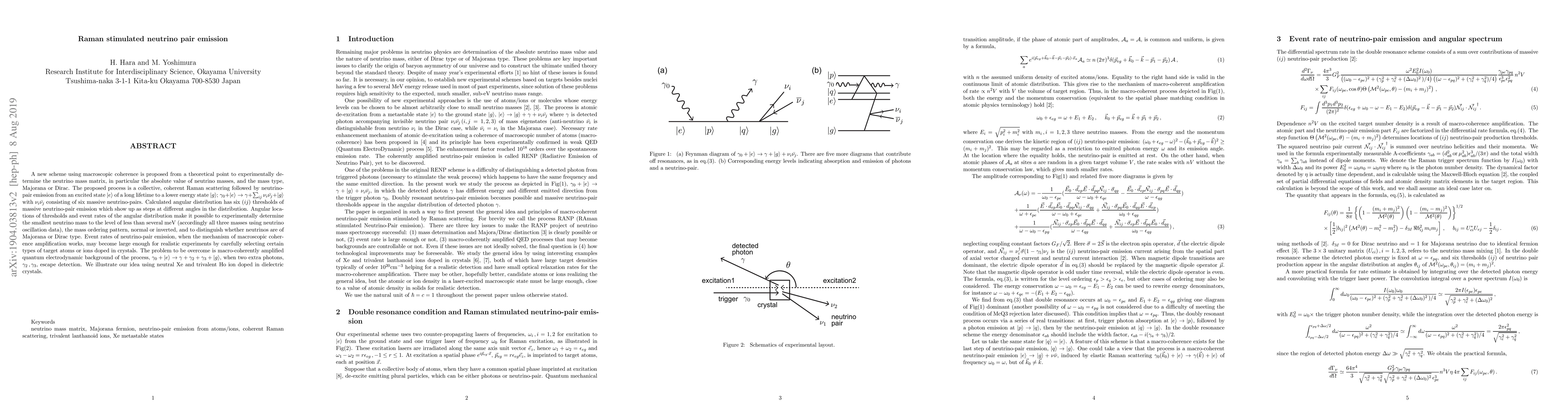 A new scheme using macroscopic coherence is proposed from a theoretical point to experimentally determine the neutrino mass matrix, in particular the absolute value of neutrino masses, and the mass type, Majorana or Dirac. The proposed process is a collective, coherent Raman scattering followed by neutrino-pair emission from an excited state $|e\rangle$ of a long lifetime to a lower energy state $|g\rangle$; $\gamma_0 + | e\rangle \rightarrow \gamma + \sum_{ij} \nu_i \bar{\nu_j} + | g\rangle $ with $ \nu_i \bar{\nu_j}$ consisting of six massive neutrino-pairs. Calculated angular distribution has six $(ij)$ thresholds of massive neutrino-pair emission which show up as steps at different angles in the distribution. Angular locations of thresholds and event rates of the angular distribution make it possible to experimentally determine the smallest neutrino mass to the level of less than 1 meV (accordingly all three masses using neutrino oscillation data) , the mass ordering pattern , normal or inverted, and to distinguish whether neutrinos are of Majorana or Dirac type. Event rates of neutrino-pair emission, when the mechanism of macroscopic coherence amplification works, may become large enough for realistic experiments by carefully selecting certain types of target atoms or ions doped in crystals. The problem to be overcome is macro-coherently amplified quantum electrodynamic background of the process, $\gamma_0 + | e\rangle \rightarrow \gamma +\gamma_2 + \gamma_3+ | g\rangle $, when two extra photons, $\gamma_2\,, \gamma_3$, escape detection. We illustrate our idea using neutral Xe and trivalent Ho ion doped in dielectric crystals.