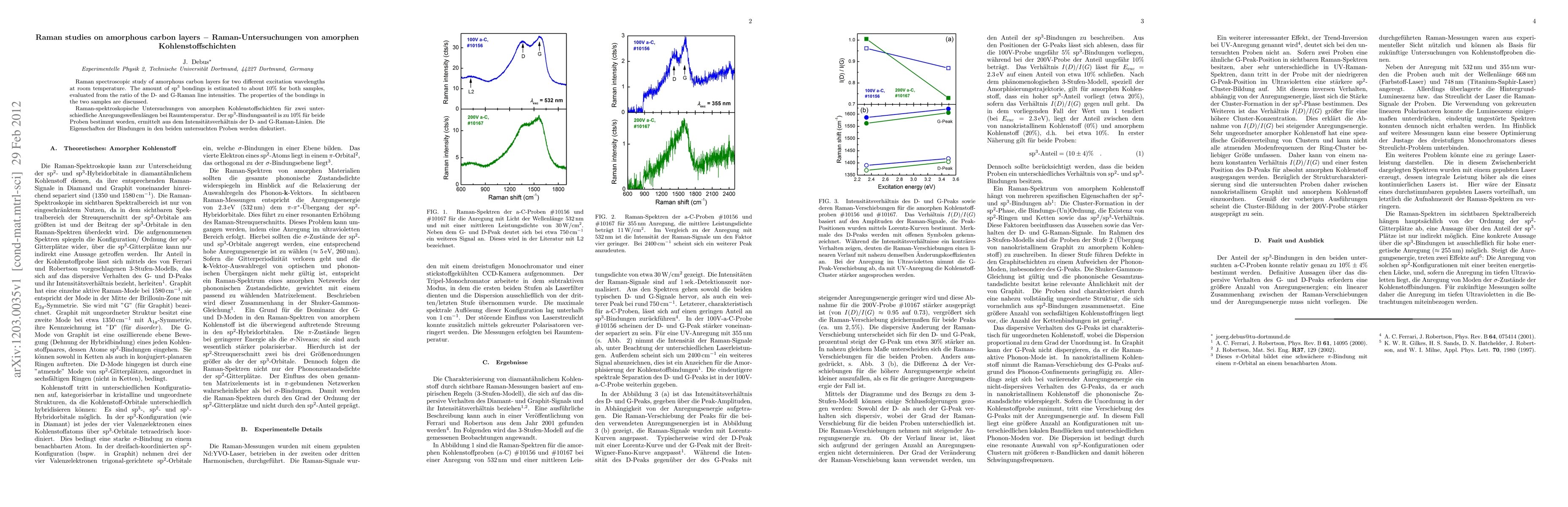Raman spectroscopic study of amorphous carbon layers for two different excitation wavelengths at room temperature. The amount of sp3 bondings is estimated to about 10% for both samples, evaluated from the ratio of the D- and G-Raman line intensities. The properties of the bondings in the two samples are discussed. Raman-spektroskopische Untersuchungen von amorphen Kohlenstoffschichten fuer zwei unterschiedliche Anregungswellenlaengen bei Raumtemperatur. Der sp3-Bindungsanteil is zu 10% fuer beide Proben bestimmt worden, ermittelt aus dem Intensitaetsverhaeltnis der D- and G-Raman-Linien. Die Eigenschaften der Bindungen in den beiden untersuchten Proben werden diskutiert.