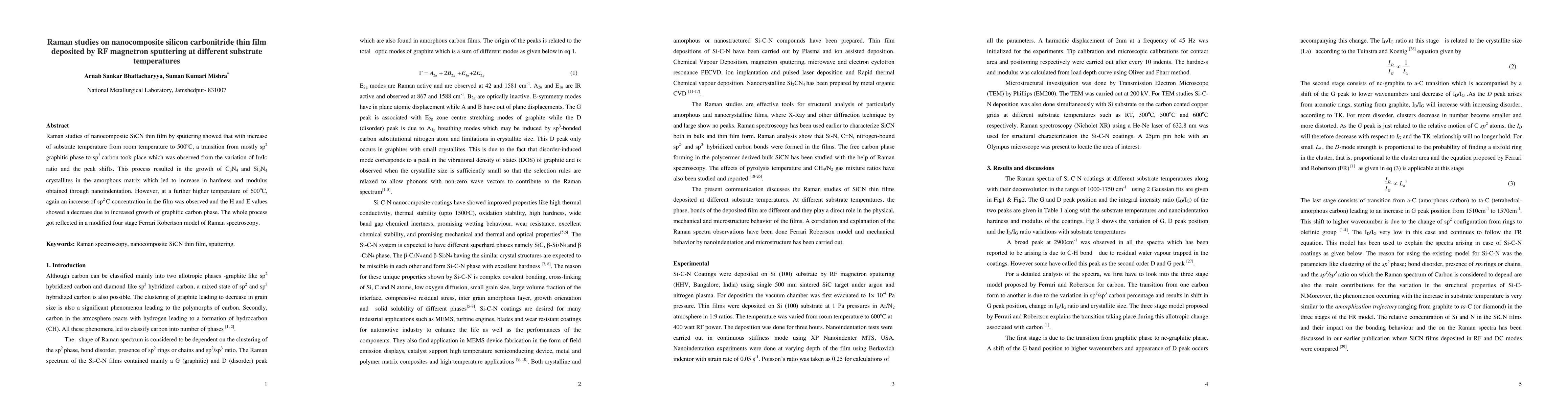 Raman studies of nanocomposite SiCN thin film by sputtering showed that with an increase of substrate temperature from room temperature to 500oC, a transition from mostly sp2 graphitic phase to sp3 carbon took place which was observed from the variation of ID/IG ratio and the peak shifts. This process resulted in the growth of C3N4 and Si3N4 crystallites in the amorphous matrix which led to an increase in hardness and modulus obtained through nanoindentation. However, at a further higher temperature of 600oC, again an increase of sp2 C concentration in the film was observed and the H and E values showed a decrease due to increased growth of graphitic carbon phase. The whole process got reflected in a modified four stage Ferrari Robertson model of Raman spectroscopy.