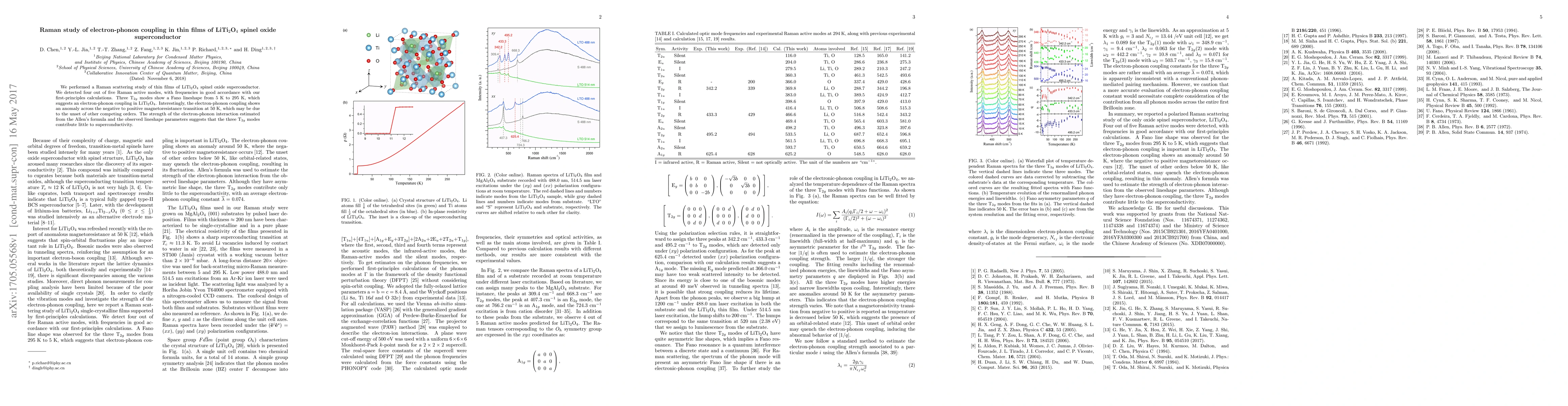 We performed a Raman scattering study of thin films of LiTi$_2$O$_4$ spinel oxide superconductor. We detected four out of five Raman active modes, with frequencies in good accordance with our first-principles calculations. Three T$_{2g}$ modes show a Fano lineshape from 5 K to 295 K, which suggests an electron-phonon coupling in LiTi$_2$O$_4$. Interestingly, the electron-phonon coupling shows an anomaly across the negative to positive magnetoresistance transition at 50 K, which may be due to the unset of other competing orders. The strength of the electron-phonon interaction estimated from the Allen's formula and the observed lineshape parameters suggests that the three T$_{2g}$ modes contribute little to superconductivity.