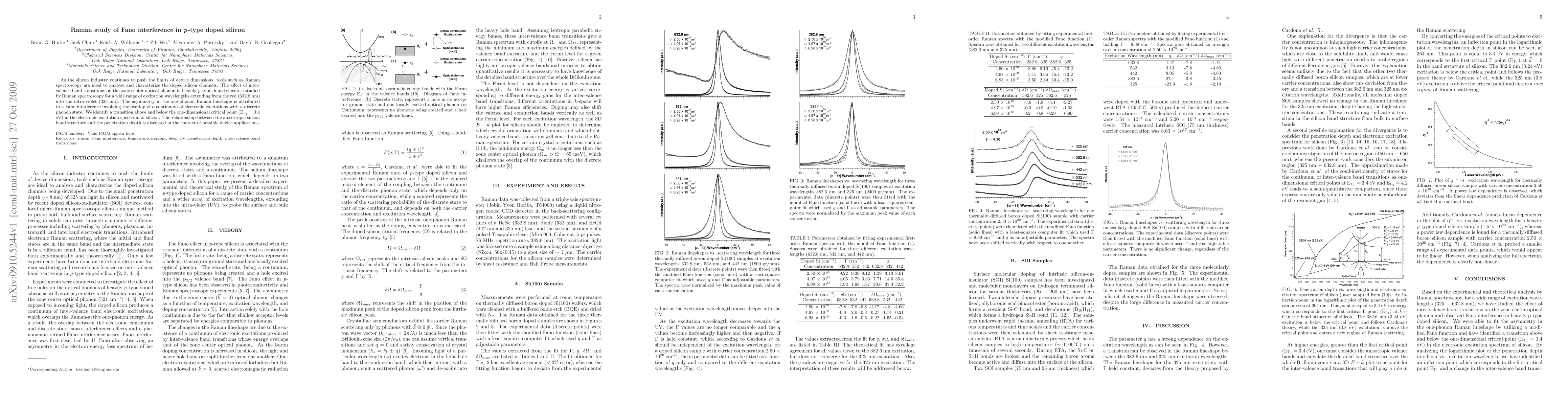 As the silicon industry continues to push the limits of device dimensions, tools such as Raman spectroscopy are ideal to analyze and characterize the doped silicon channels. The effect of inter-valence band transitions on the zone center optical phonon in heavily p-type doped silicon is studied by Raman spectroscopy for a wide range of excitation wavelengths extending from the red (632.8 nm) into the ultra-violet (325 nm). The asymmetry in the one-phonon Raman lineshape is attributed to a Fano interference involving the overlap of a continuum of electronic excitations with a discrete phonon state. We identify a transition above and below the one-dimensional critical point (E = 3.4 eV) in the electronic excitation spectrum of silicon. The relationship between the anisotropic silicon band structure and the penetration depth is discussed in the context of possible device applications.