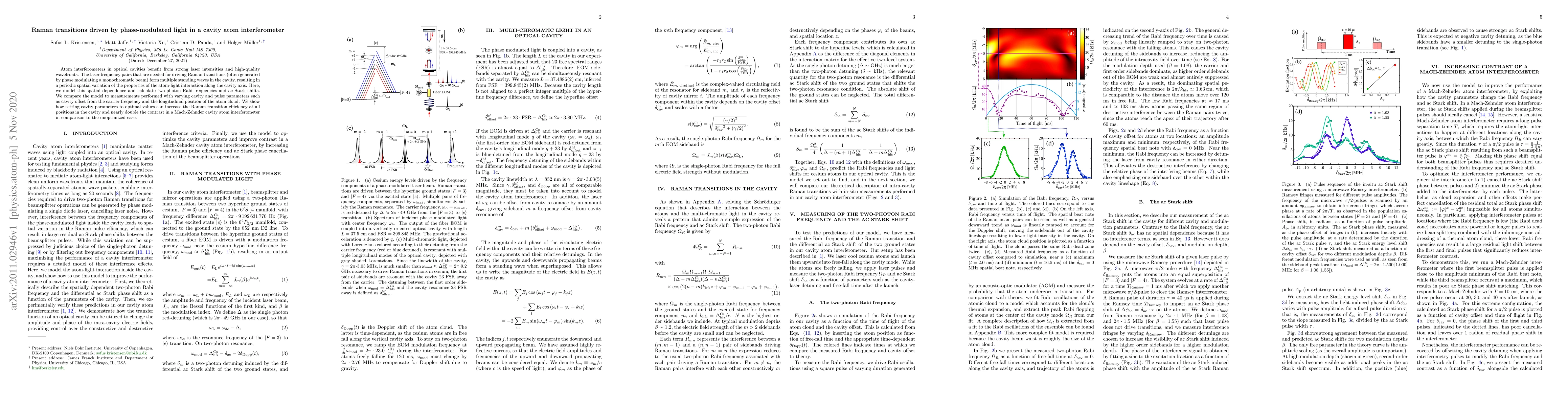 This paper models the spatial dependence of Raman transitions driven by phase-modulated light in a cavity atom interferometer, calculating two-photon Rabi frequencies and ac Stark shifts. The study shows that optimizing cavity parameters can significantly enhance Raman transition efficiency and interferometer contrast.