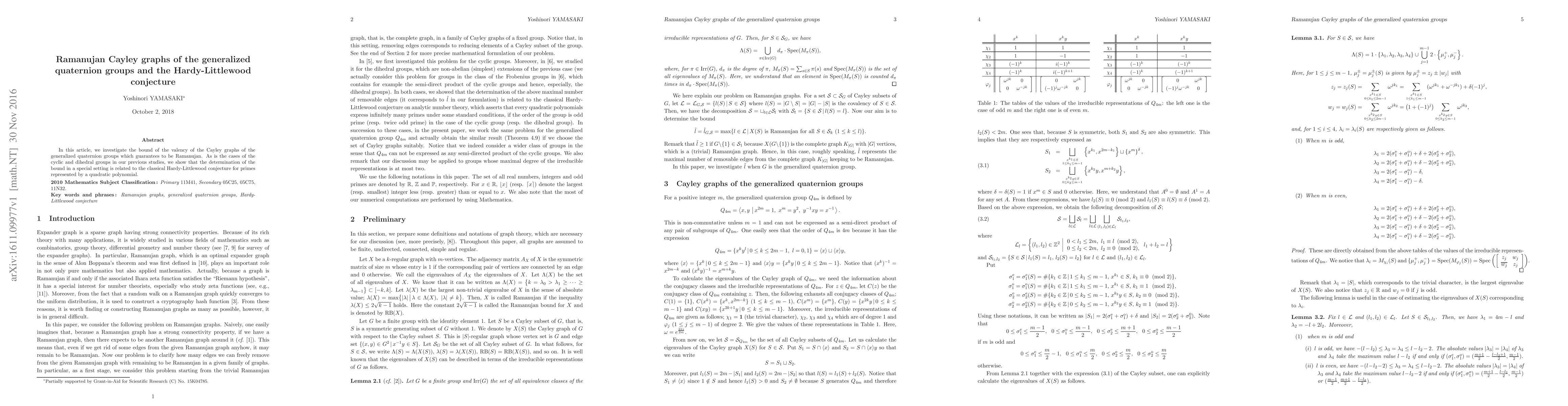 This paper explores the minimum valency needed for Cayley graphs of generalized quaternion groups to be Ramanujan, demonstrating a connection to the Hardy-Littlewood conjecture regarding primes represented by quadratic polynomials. The findings parallel results obtained for cyclic and dihedral groups.