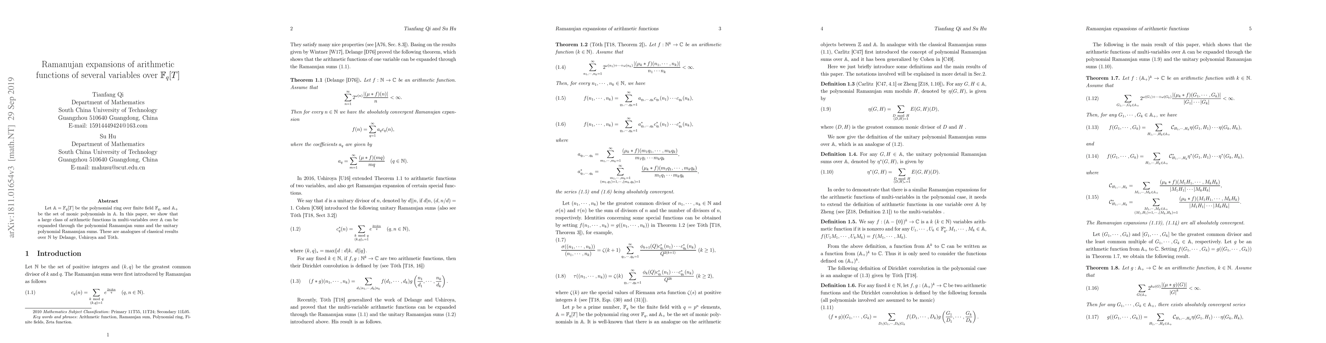 Let $\mathbb{A}=\mathbb{F}_{q}[T]$ be the polynomial ring over finite field $\mathbb{F}_{q}$, and $\mathbb{A}_{+}$ be the set of monic polynomials in $\mathbb{A}$. In this paper, we show that a large class of arithmetic functions in multi-variables over $\mathbb{A}_{+}$ can be expanded through the polynomial Ramanujan sums and the unitary polynomial Ramanujan sums. These are analogues of classical results over $\mathbb{N}$ by Winter, Delange and T\'oth.