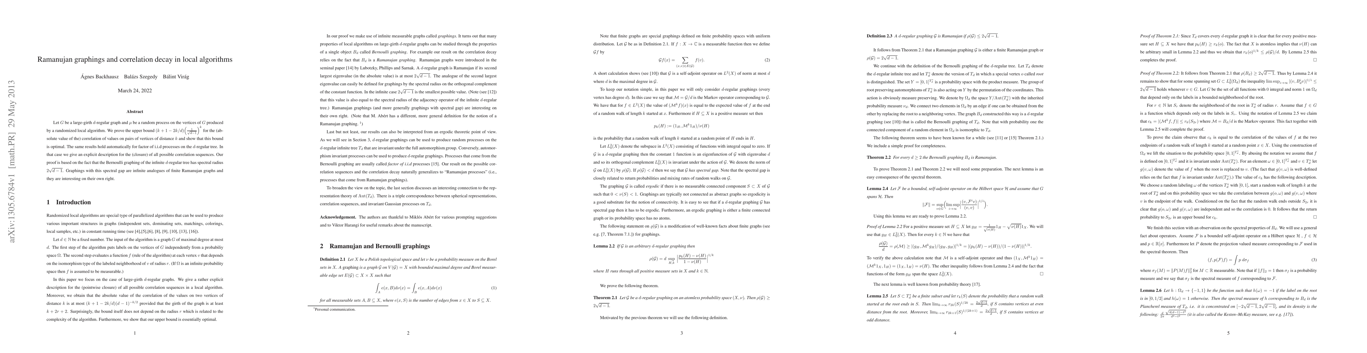 Let $G$ be a large-girth $d$-regular graph and $\mu$ be a random process on the vertices of $G$ produced by a randomized local algorithm. We prove the upper bound $(k+1-2k/d)\Bigl(\frac{1}{\sqrt{d-1}}\Bigr)^k$ for the (absolute value of the) correlation of values on pairs of vertices of distance $k$ and show that this bound is optimal. The same results hold automatically for factor of i.i.d processes on the $d$-regular tree. In that case we give an explicit description for the (closure) of all possible correlation sequences. Our proof is based on the fact that the Bernoulli graphing of the infinite $d$-regular tree has spectral radius $2\sqrt{d-1}$. Graphings with this spectral gap are infinite analogues of finite Ramanujan graphs and they are interesting on their own right.