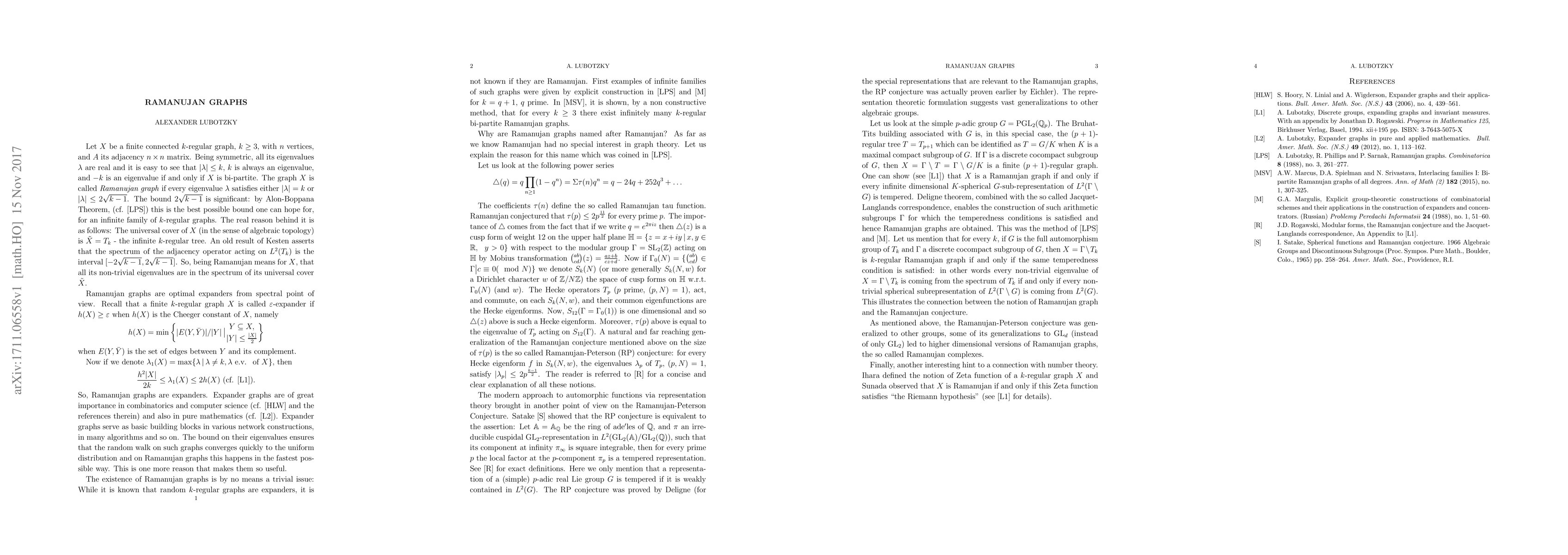 Summary: This paper introduces Ramanujan graphs, which are highly efficient expander graphs, and explains why they are named after the mathematician Ramanujan due to their remarkable spectral properties reflecting deep mathematical insights.