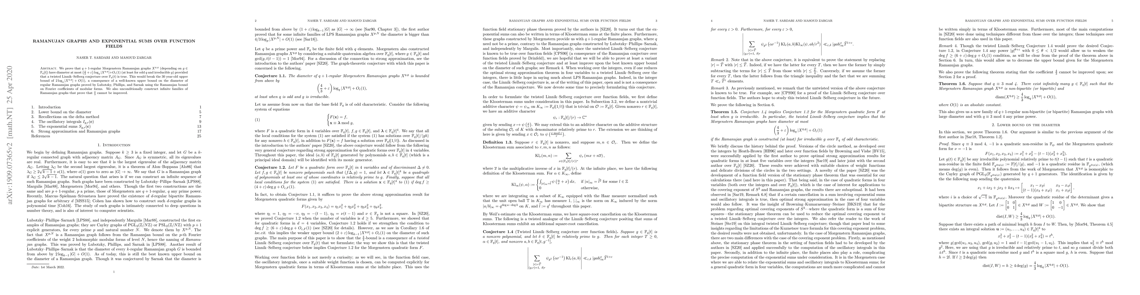 We prove that $q+1$-regular Morgenstern Ramanujan graphs $X^{q,g}$ (depending on $g\in\mathbb{F}_q[t]$) have diameter at most $\left(\frac{4}{3}+\varepsilon\right)\log_{q}|X^{q,g}|+O_{\varepsilon}(1)$ (at least for odd $q$ and irreducible $g$) provided that a twisted Linnik-Selberg conjecture over $\mathbb{F}_q(t)$ is true. This would break the 30 year-old upper bound of $2\log_{q}|X^{q,g}|+O(1)$, a consequence of a well-known upper bound on the diameter of regular Ramanujan graphs proved by Lubotzky, Phillips, and Sarnak using the Ramanujan bound on Fourier coefficients of modular forms. We also unconditionally construct infinite families of Ramanujan graphs that prove that $\frac{4}{3}$ cannot be improved.