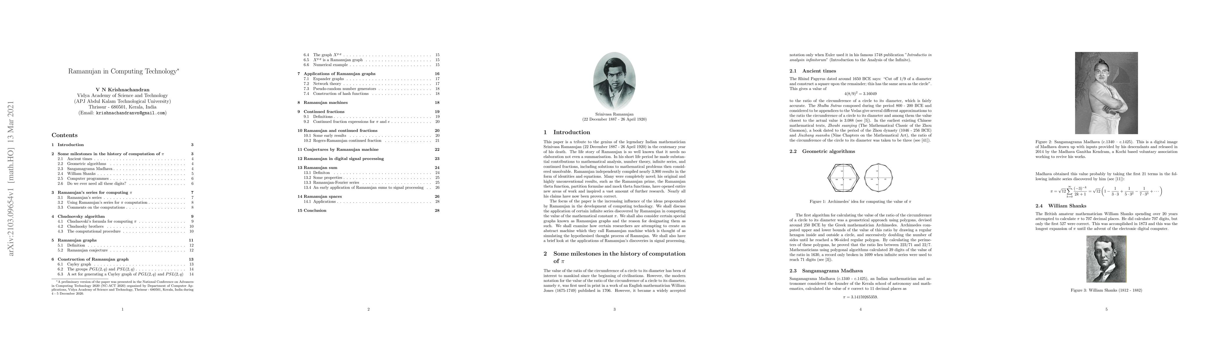 This paper honors Srinivasa Ramanujan's legacy in computing technology, exploring his contributions to infinite series, pi calculation, graph theory, and signal processing, with implications for creating an abstract machine simulating Ramanujan's thought process.
